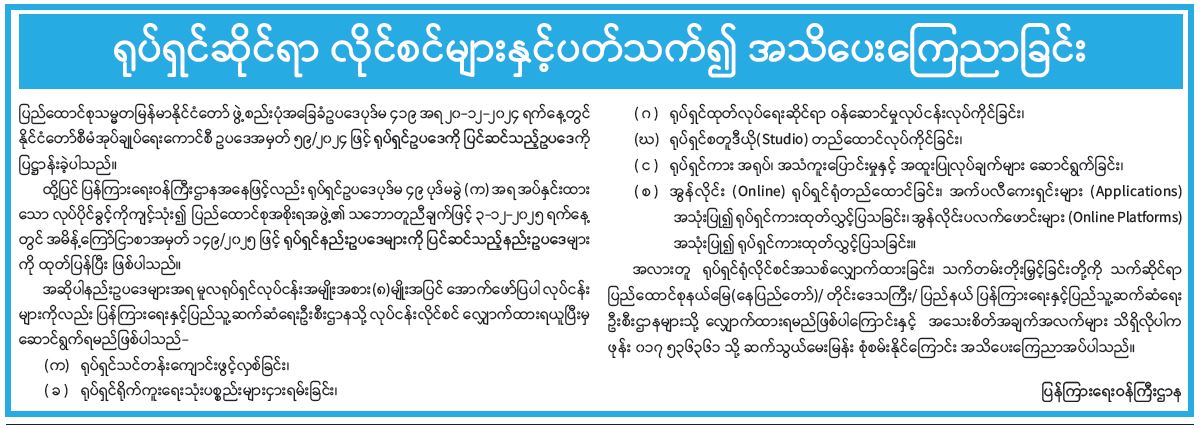 ရုပ်ရှင်ဆိုင်ရာ လိုင်စင်များနှင့်ပတ်သက်၍ အသိပေးကြေညာခြင်း