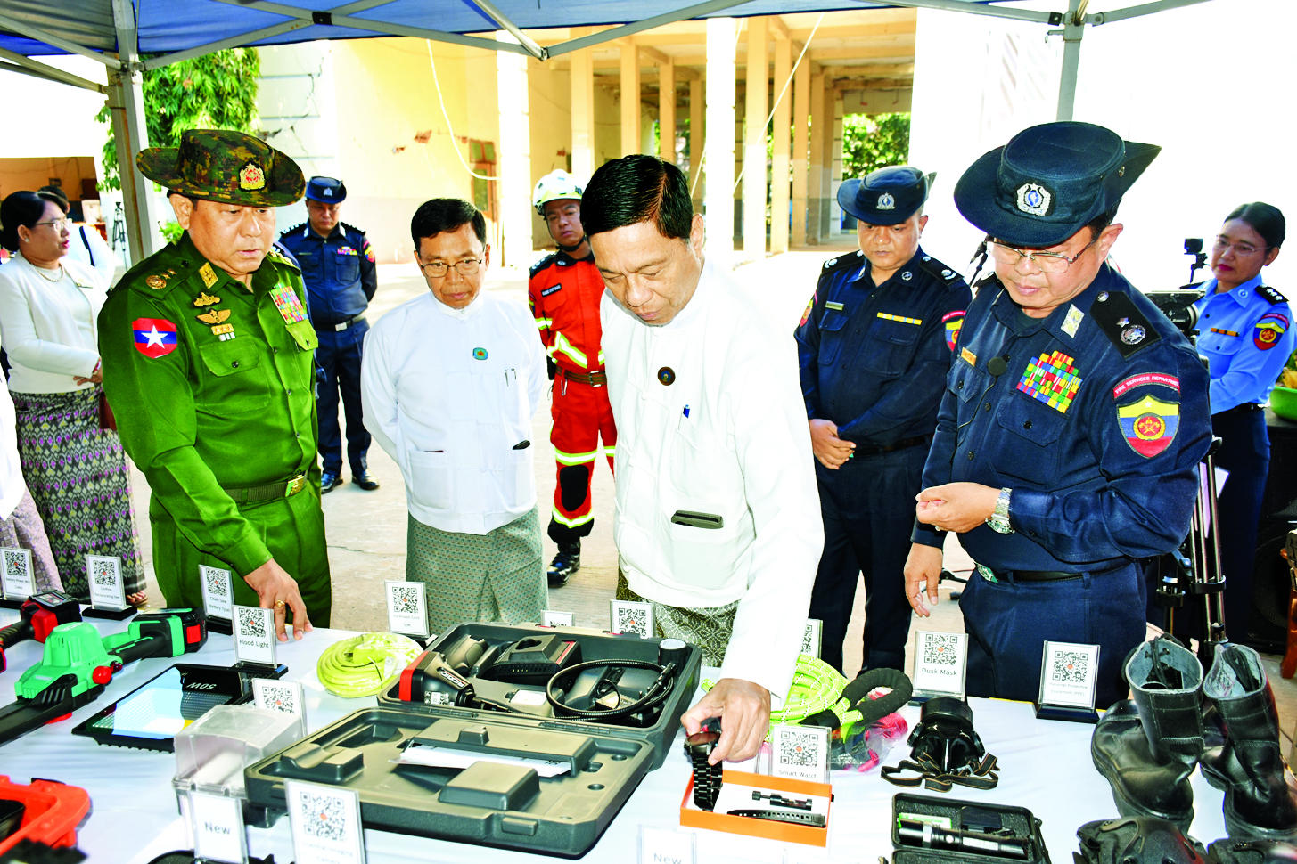 ဦးစွာ နေပြည်တော်ဗဟို မီးသတ်စခန်းတွင် ပြည်ထောင်စုဝန်ကြီး ဒုတိယဗိုလ်ချုပ်ကြီး ထွန်းထွန်းနောင်၊ ပြည်ထောင်စုဝန်ကြီး ဒေါက်တာစိုးဝင်းနှင့် ဧည့်သည်တော်များက ခင်းကျင်း ပြသထားသည့် နိုင်ငံတကာရှာဖွေကယ်ဆယ်ရေးလုပ်ငန်းသုံး ခေတ်မီယာဉ်/စက်ပစ္စည်းကိရိယာများကို လှည့်လည်ကြည့်ရှုစစ်ဆေးပြီး မီးသတ်ဦးစီးဌာန ညွှန်ကြားရေးမှူးချုပ်ဦးမြတ်သူက Medium Team နှစ်ခုကို သတ်မှတ်ယာဉ်/စက် ပစ္စည်းများဖြင့် ပြင်ဆင်စုဖွဲ့ လေ့ကျင့်ခဲ့မှုအခြေအနေများကို ရှင်းလင်းတင်ပြသည်။