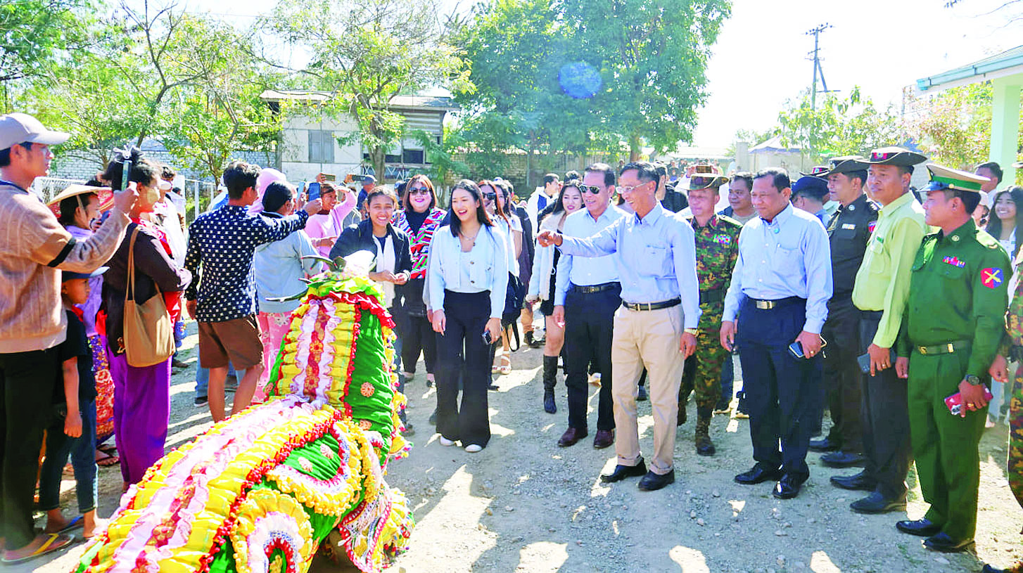 ထို့နောက် ပြန်ကြားရေးနှင့်တိုးတက်ခိုင်မာအားကောင်းသည့် လူမှုအသိုက်အဝန်းဖော်ဆောင်ရေးတွေ့ဆုံပွဲကျင်းပမည့် နောင်ချိုမြို့အားကစားရုံသို့ရောက်ရှိကြရာ တပ်မတော်သားများ၊ ဌာနဆိုင်ရာဝန်ထမ်းများ၊ ကျောင်းသား ကျောင်းသူများနှင့် ပြည်သူများက လှိုက်လှဲနွေးထွေးစွာကြိုဆိုကြပြီး အနုပညာရှင်များနှင့်အတူ အမှတ်တရဓာတ်ပုံရိုက်ကြသည်။