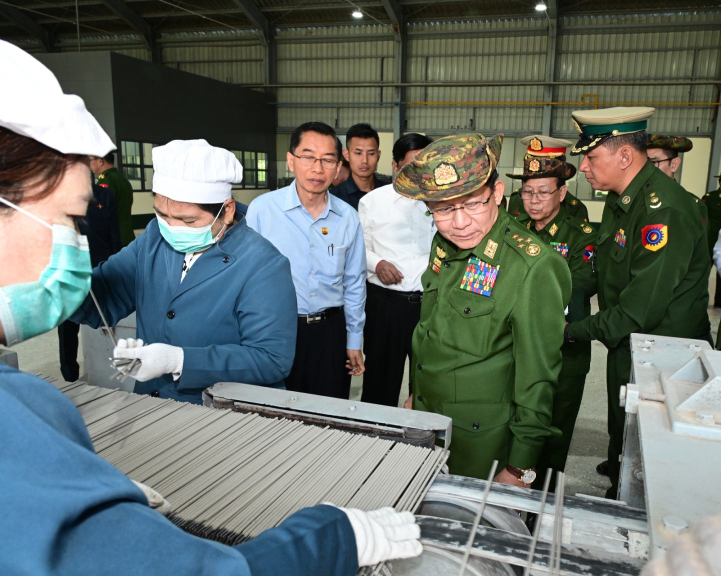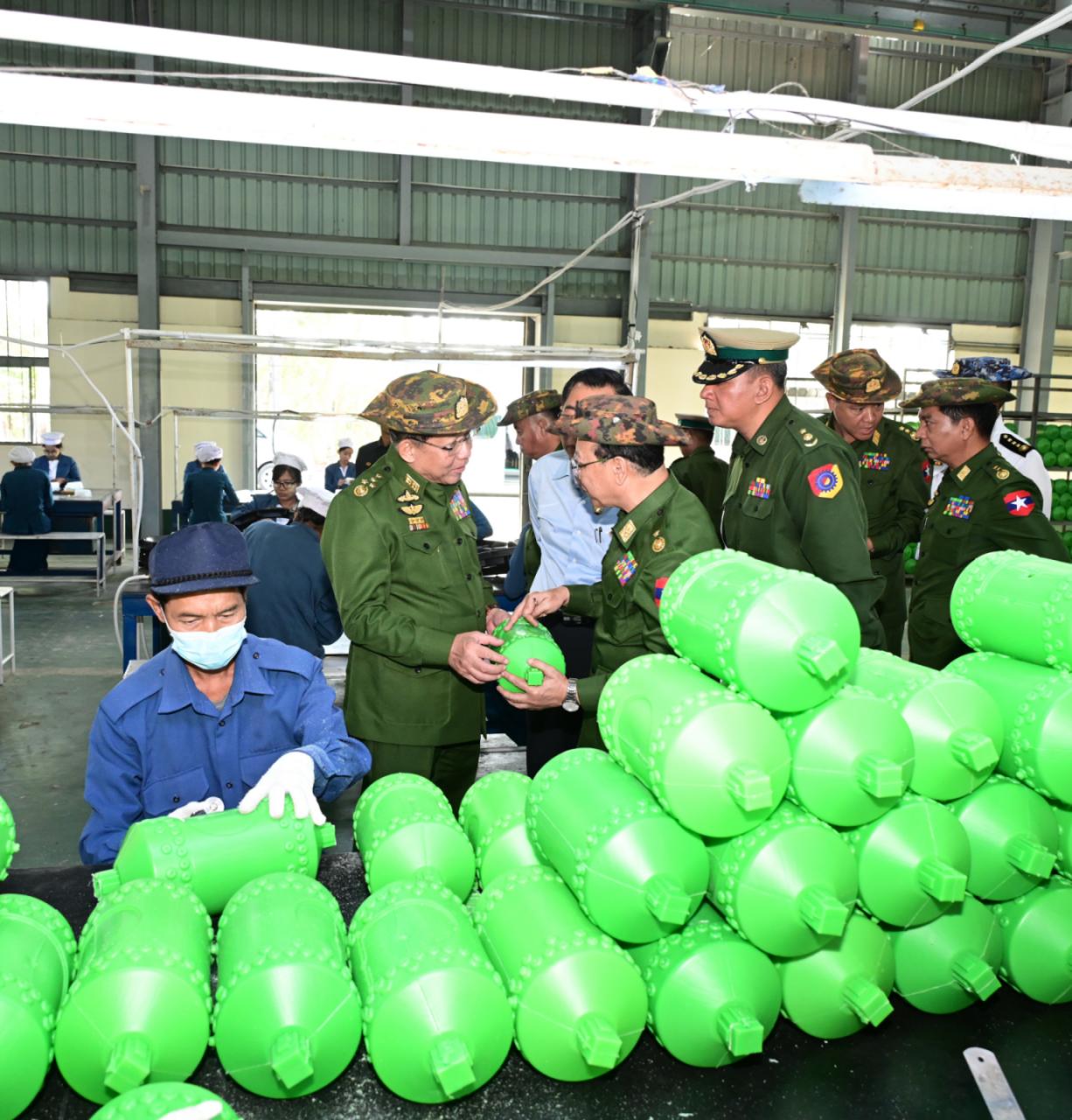 ယင်းနောက် နိုင်ငံတော်လုံခြုံရေးနှင့် အေးချမ်းသာယာရေးကော်မရှင်ဥက္ကဋ္ဌ တပ်မတော်ကာကွယ်ရေးဦးစီးချုပ်နှင့် အဖွဲ့ဝင်များသည် စက်ရုံအတွင်းအလုပ်ရုံများအား လှည့်လည်၍ လက်ဆွဲကောက်စိုက်စက်၊ Manual Drum Seeder များနှင့် ဆက်စပ်ပစ္စည်းများ ထုတ်လုပ်နေမှု၊ သံရည်ကြိုအလုပ်ရုံအတွင်း စက်ပစ္စည်းအစိတ်အပိုင်းများ သွန်းလောင်းထုတ်လုပ်နေမှု၊ သံဂဟေချောင်းအလုပ်ရုံအတွင်း သံဂဟေချောင်းများ အဆင့်ဆင့်ထုတ်လုပ်နေမှုတို့ကို ကြည့်ရှုစစ်ဆေးခဲ့ပြီး တာဝန်ရှိသူများ၏တင်ပြချက်များအပေါ် လိုအပ်သည်များ လမ်းညွှန်မှာကြားသည်။