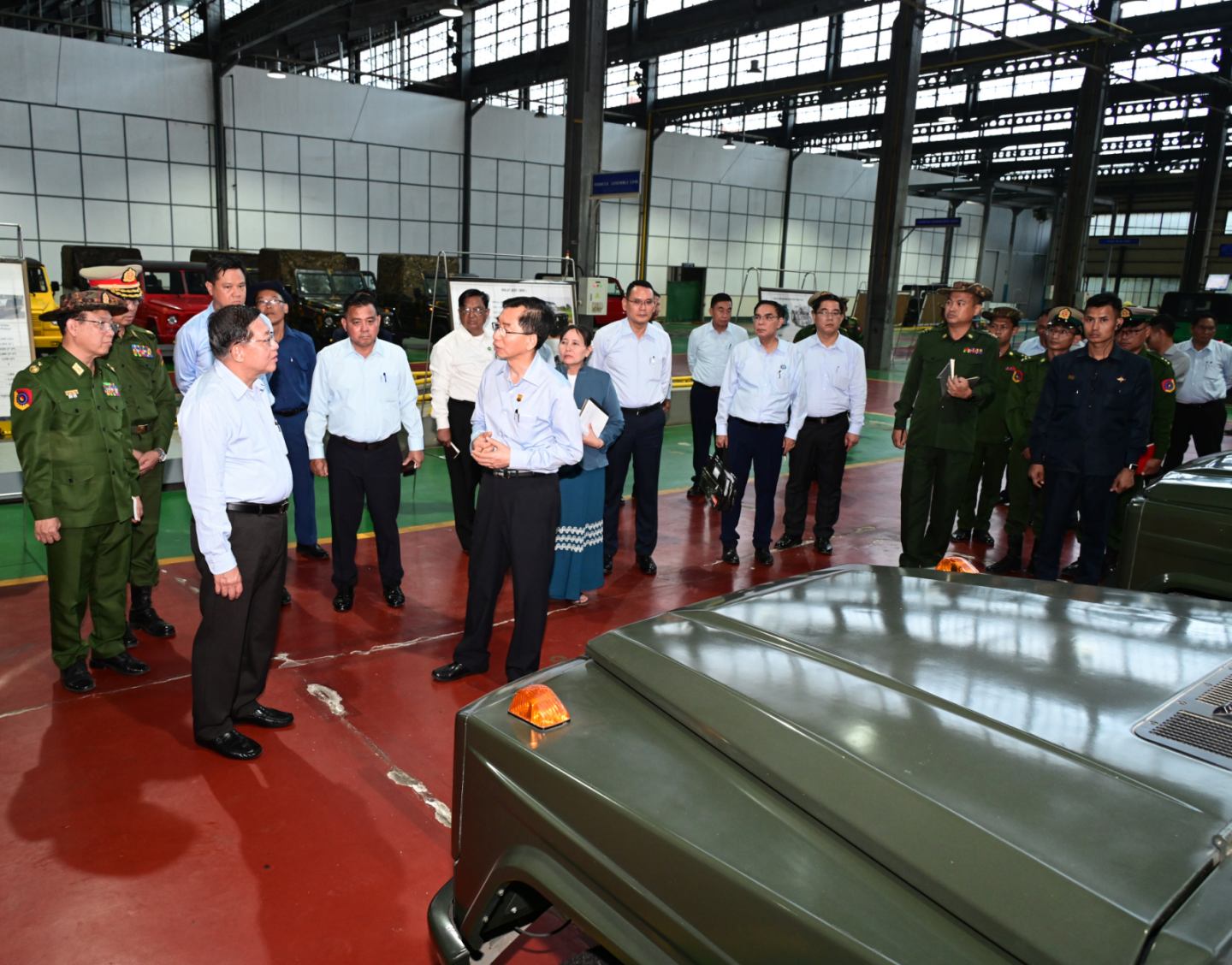 ယင်းနောက် နိုင်ငံတော်လုံခြုံရေးနှင့် အေးချမ်းသာယာရေးကော်မရှင်ဥက္ကဋ္ဌ တပ်မတော်ကာကွယ်ရေးဦးစီးချုပ်နှင့် အဖွဲ့ဝင်များသည် စက်ရုံအတွင်းရှိ အလုပ်ရုံများအတွင်း မော်တော်ယာဉ်များထုတ်လုပ်နေမှု လုပ်ငန်းစဉ်အဆင့်ဆင့်၊ ထုတ်လုပ်ပြီး မော်တော်ယာဉ်များအား စစ်ဆေးစမ်းသပ်နေမှုနှင့် ထုတ်လုပ်ထားရှိသည့် မော်တော်ယာဉ်များအား လိုက်လံကြည့်ရှုစစ်ဆေးခဲ့ပြီး တာဝန်ရှိသူများ၏ တင်ပြချက်များအပေါ် လိုအပ်သည်များ လမ်းညွှန်မှာကြား ဖြည့်ဆည်းဆောင်ရွက်ပေးခဲ့သည်။