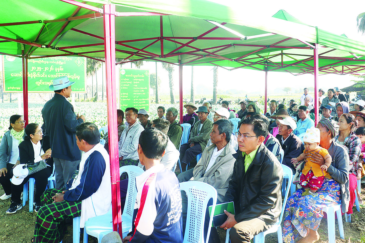ဆက်လက်၍ ကွင်းသရုပ်ပြပွဲတက်ရောက်လာကြသည့် တောင်သူများ၏ လုပ်ငန်းခွင်ဆိုင်ရာ တင်ပြချက်များအပေါ် ဒုတိယဝန်ကြီးက သက်ဆိုင်ရာဌာနတာဝန်ရှိသူများနှင့် ညှိနှိုင်းပေါင်းစပ်ဆောင်ရွက်ပေးသည်။