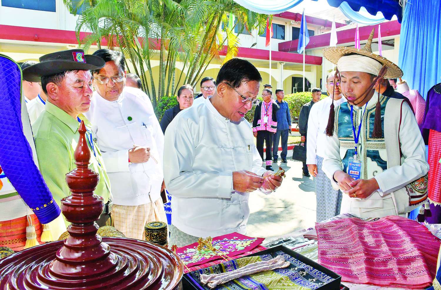 ယင်းနောက် နိုင်ငံတော်ယာယီသမ္မတ နိုင်ငံတော်လုံခြုံရေးနှင့်အေးချမ်းသာယာရေးကော်မရှင်ဥက္ကဋ္ဌနှင့်အဖွဲ့ဝင်များသည် ခင်းကျင်းပြသထားသည့် ရှမ်းပြည်နယ်(အရှေ့ပိုင်း)အတွင်းရှိ အသေးစား၊ အငယ်စားနှင့်အလတ်စားစီးပွားရေး(MSME) လုပ်ငန်းများမှထွက်ရှိသည့် ထုတ်ကုန်ပစ္စည်းများအား ပြခန်းတစ်ခုချင်းစီအလိုက် စိတ်ပါဝင်စားစွာဖြင့် လှည့်လည်ကြည့်ရှုပြီး တာဝန်ရှိသူများ၏ တင်ပြချက်များအပေါ် လိုအပ်သည်များ လမ်းညွှန်မှာကြားခဲ့ကြောင်း သတင်းရရှိသည်။