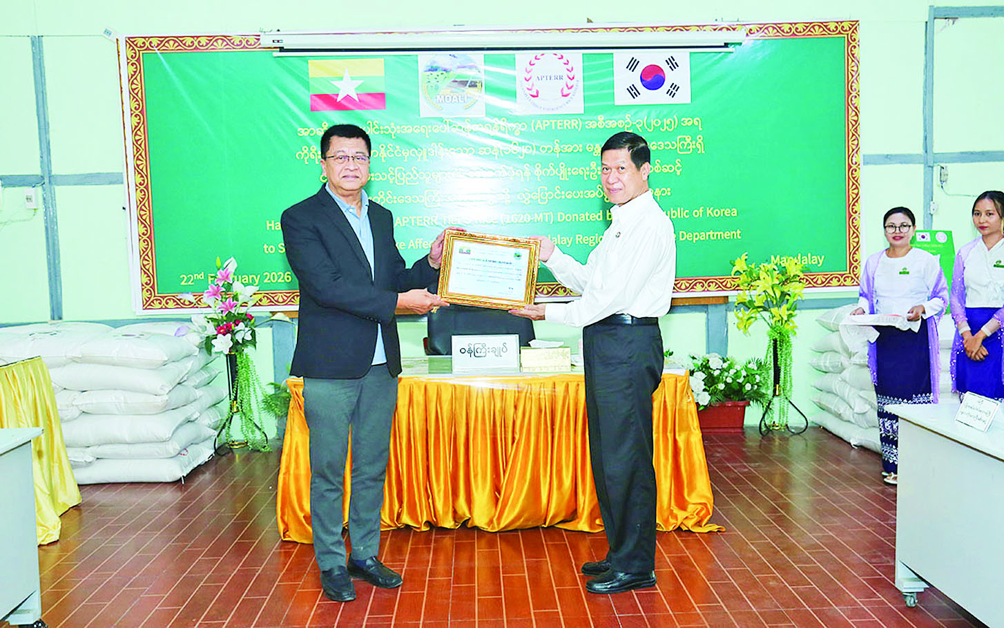 အာဆီယံအပေါင်းသုံး အရေးပေါ်ဆန်ရိက္ခာ (APTERR) အစီအစဉ်-၃ (၂၀၂၅) အရ ကိုရီးယားသမ္မတနိုင်ငံမှ လှူဒါန်းသော ဆန်တန်ချိန် ၁၆၂၀ ကို မန္တလေးတိုင်းဒေသကြီး စိုက်ပျိုးရေးဦးစီးဌာနမှတစ်ဆင့် မန္တလေးတိုင်းဒေသကြီးအစိုးရအဖွဲ့ထံသို့ လွှဲပြောင်းပေးအပ်ပွဲအခမ်းအနားကို ယနေ့မွန်းလွဲပိုင်းက ချမ်းမြသာစည်မြို့နယ်ရှိ တိုင်းဒေသကြီး စိုက်ပျိုးရေးဦးစီးဌာန၌ ကျင်းပသည်။