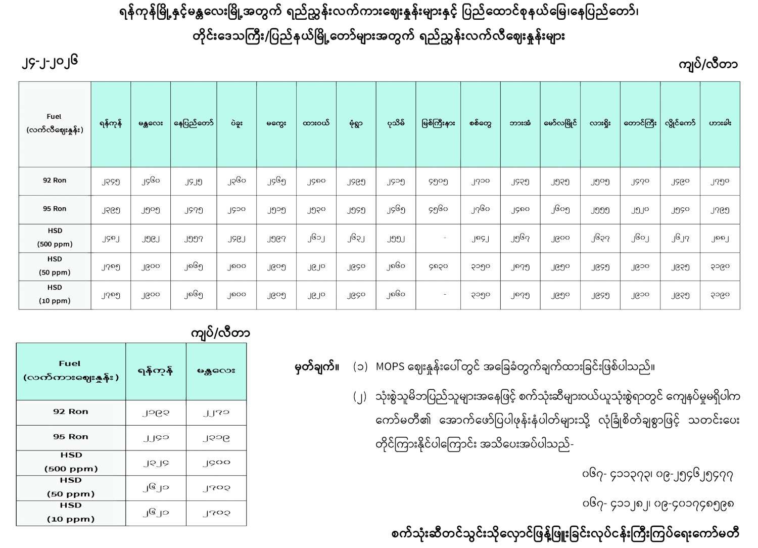ရန်ကုန်မြို့နှင့် မန္တလေးမြို့အတွက် ရည်ညွှန်းလက်ကားဈေးနှုန်းများနှင့် ပြည်ထောင်စုနယ်မြေ နေပြည်တော်၊ တိုင်းဒေသကြီး/ပြည်နယ် မြို့တော်များအတွက် ရည်ညွှန်းလက်လီဈေးနှုန်းများ 02/24/2026