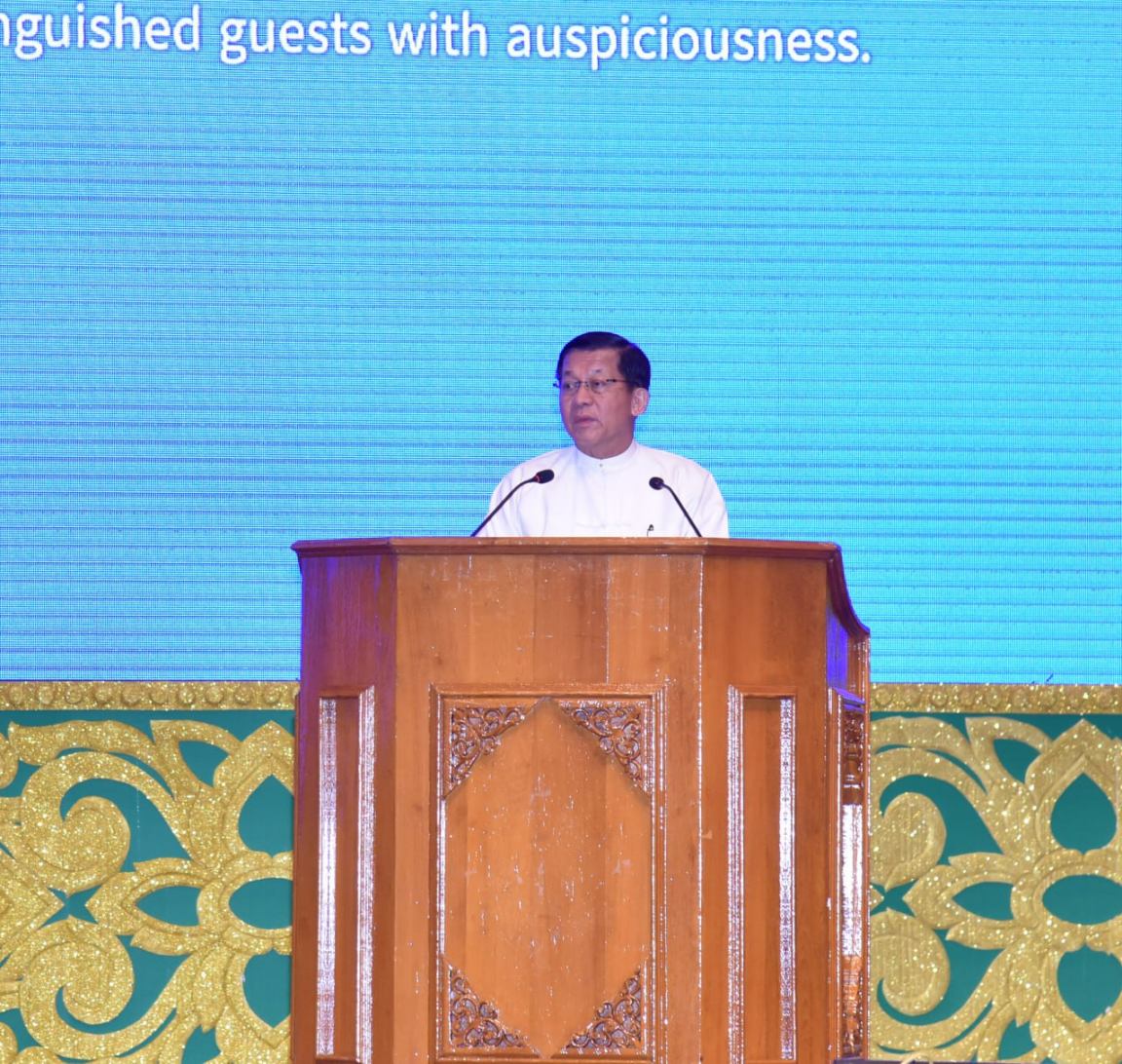 မြန်မာ့မျက်နှာစာသစ်ဖိုရမ်(ယုံကြည်မှု၊ တည်ငြိမ်အေးချမ်းမှုနှင့် ဖွံ့ဖြိုးတိုးတက်မှု) Forum on The Dawn of A New State (Trust, Stability & Development) ဖွင့်ပွဲအခမ်းအနားအား ယနေ့နံနက်ပိုင်းတွင် နေပြည်တော်ရှိ မြန်မာအပြည်ပြည်ဆိုင်ရာ ကွန်ဗင်းရှင်းဗဟိုဌာန(၁) (MICC-1) ၌ ကျင်းပပြုလုပ်ရာ ပြည်ထောင်စုသမ္မတမြန်မာနိုင်ငံတော် ယာယီသမ္မတ နိုင်ငံတော်လုံခြုံရေးနှင့် အေးချမ်းသာယာရေးကော်မရှင်ဥက္ကဋ္ဌ ဗိုလ်ချုပ်မှူးကြီး မင်းအောင်လှိုင် တက်ရောက်အမှာစကားပြောကြားသည်။