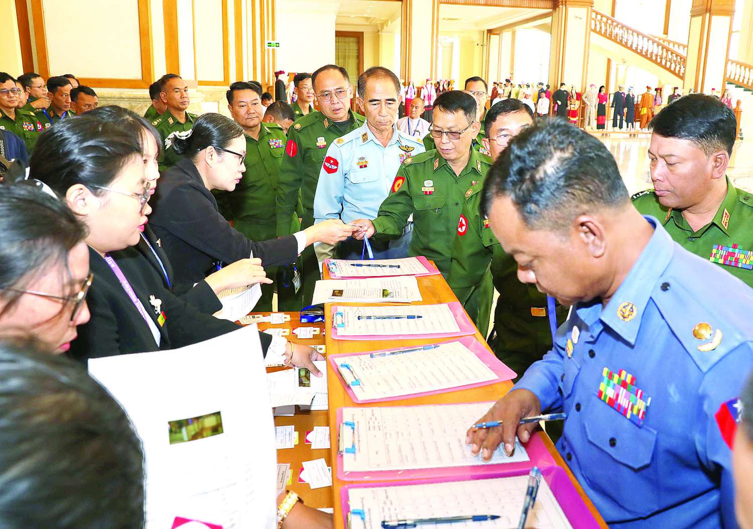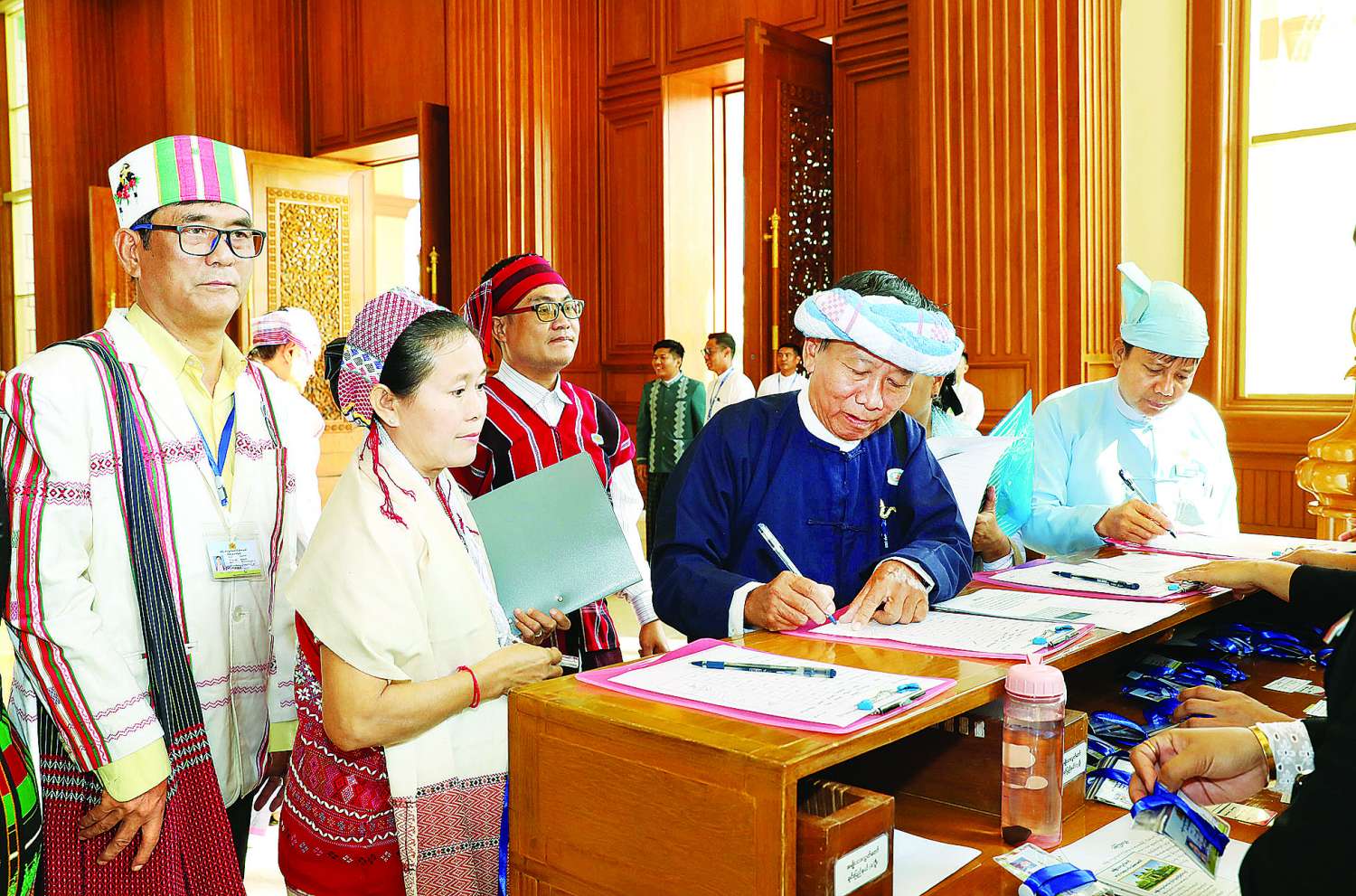 ယင်းနောက် အမျိုးသားလွှတ်တော်ကိုယ်စားလှယ်များက သဘာပတိရှေ့မှောက်၌ ကတိသစ္စာပြုကြပြီး ကတိသစ္စာပြုလွှာပေါ်တွင် လက်မှတ်ရေးထိုးကြသည်။