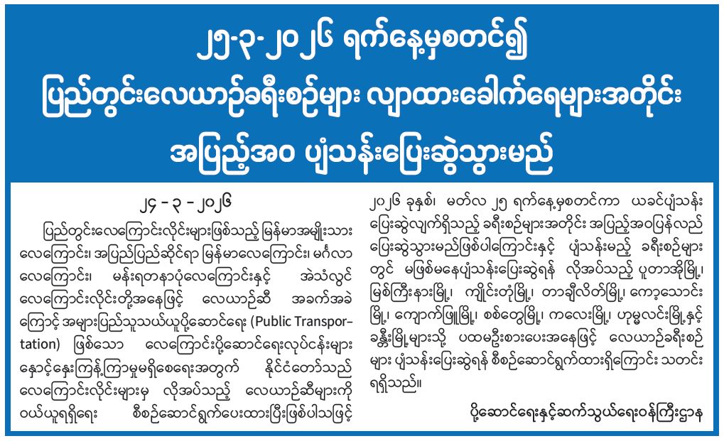 ၂၅-၃-၂၀၂၆ ရက်နေ့မှစတင်၍ ပြည်တွင်းလေယာဉ်ခရီးစဉ်များ လျာထားခေါက်ရေများအတိုင်း အပြည့်အဝ ပျံသန်းပြေးဆွဲသွားမည်