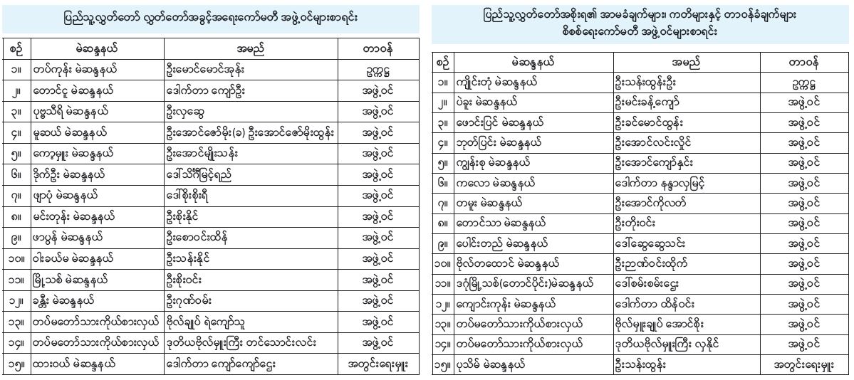 ဆက်လက်၍ ပြည်သူ့ လွှတ်တော်ဥက္ကဋ္ဌက လွှတ်တော်အခွင့်အရေးကော်မတီဖွဲ့စည်းမှုနှင့် ကော်မတီ၏ တာဝန်၊ လုပ်ပိုင်ခွင့်၊ ရပိုင်ခွင့်၊ သက်တမ်း၊ ကော်မတီအစည်းအဝေးတို့နှင့် စပ်လျဉ်းသည့် ရှင်းလင်းတင်ပြချက်များ ကို လွှတ်တော်၏ အတည်ပြုချက်ရယူရာ လွှတ်တော်က သဘောတူသည့်အတွက် လွှတ်တော်အခွင့် အရေးကော်မတီဥက္ကဋ္ဌအဖြစ် တပ်ကုန်းမဲဆန္ဒနယ်မှ ဦးမောင်မောင်အုန်း၊ အတွင်းရေးမှူး အဖြစ် ထားဝယ်မဲဆန္ဒနယ်မှ ဒေါက်တာကျော်ကျော်ဌေးအပါအဝင် အဖွဲ့ဝင် ၁၅ ဦးဖြင့် တာဝန်ပေးအပ်ဖွဲ့စည်းကြောင်းနှင့် လွှတ်တော်အခွင့်အရေးကော်မတီ၏ တာဝန်၊ လုပ်ပိုင်ခွင့်၊ ရပိုင်ခွင့်၊ သက်တမ်းနှင့် ကော်မတီအစည်း အဝေးတို့ကို လွှတ်တော်က အတည်ပြုကြောင်းကြေညာသည်။