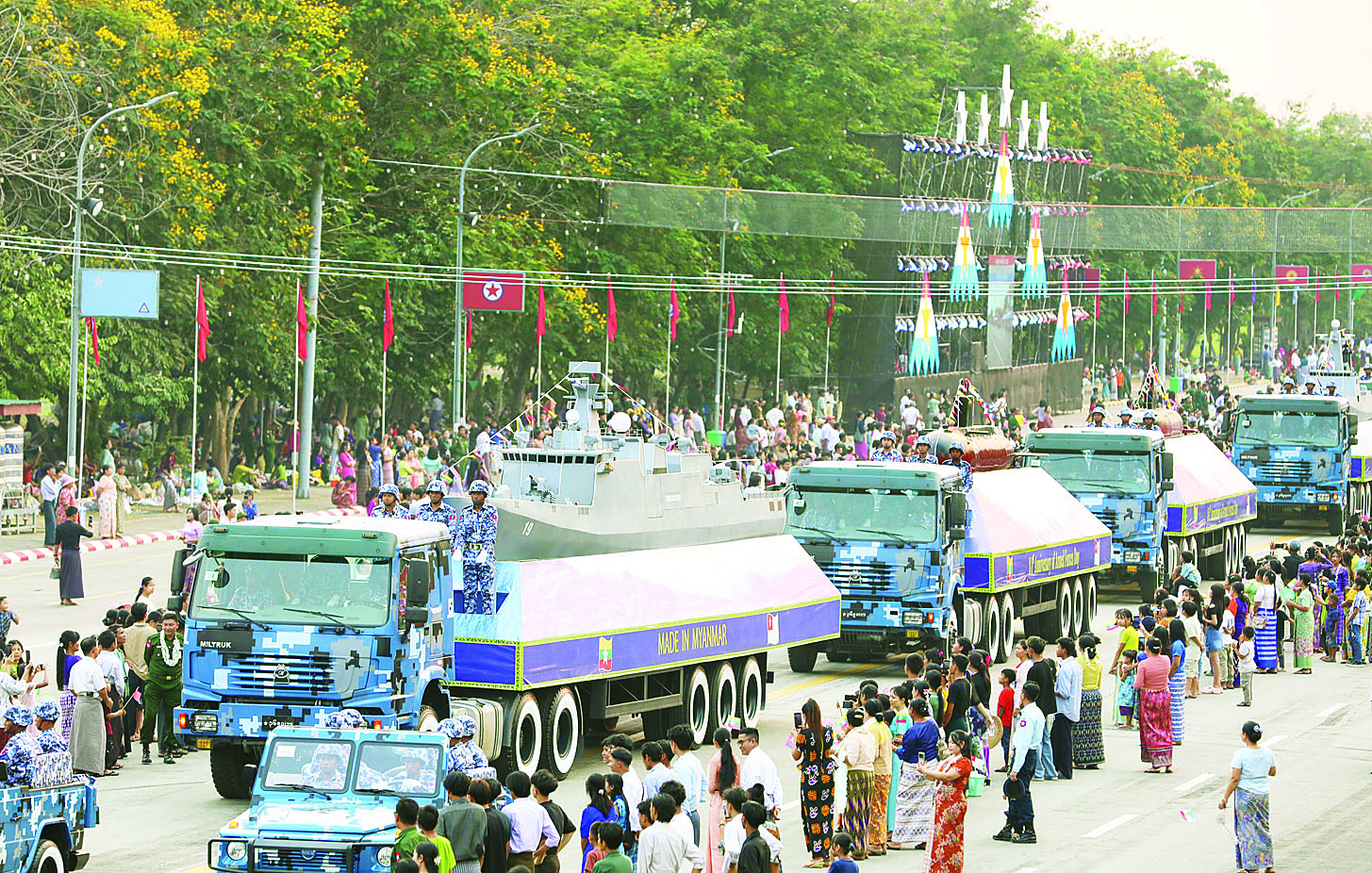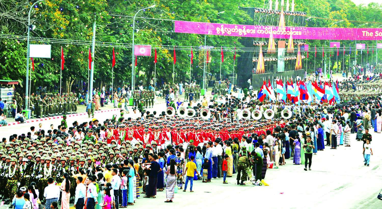 အလားတူ ကာကွယ်ရေးဦးစီးချုပ်ရုံး (ကြည်း) မှ အရာရှိ၊ စစ်သည်မိသားစုများ၊ နေပြည်တော်တိုင်းစစ်ဌာနချုပ်နှင့် တပ်နယ်အသီးသီးတို့မှ အရာရှိ၊ စစ်သည်၊ မိသားစုများ၊ မြန်မာနိုင်ငံရဲတပ်ဖွဲ့ဝင်များနှင့် မိသားစုများ၊ ဝန်ကြီးဌာနအသီးသီးမှ နိုင်ငံ့ဝန်ထမ်းများ၊ ရုပ်ရှင်ဂီတအနုပညာရှင်များ၊ ဒေသခံမိဘပြည်သူများကလည်း စစ်ကြောင်းကြီးများ ချီတက်ရာလမ်းတစ်လျှောက် သောင်းသောင်းဖြဖြကြိုဆိုကာ ဂုဏ်ပြုပန်းကုံးများစွပ်၍ ကြိုဆိုခဲ့ကြပြီး စစ်ကြောင်းကြီးများမှ တပ်မတော်သားများနှင့် မြန်မာနိုင်ငံရဲတပ်ဖွဲ့ဝင်များသည် ဇာတိသွေး၊ ဇာတိမာန်အပြည့်ဖြင့် စစ်ချီတေးများကို သံပြိုင်ဟစ်ကြွေးသီဆိုချီတက်လာကြပြီး စစ်ရေးပြကွင်းအတွင်းသို့ ရောက်ရှိနေရာယူကြသည်။