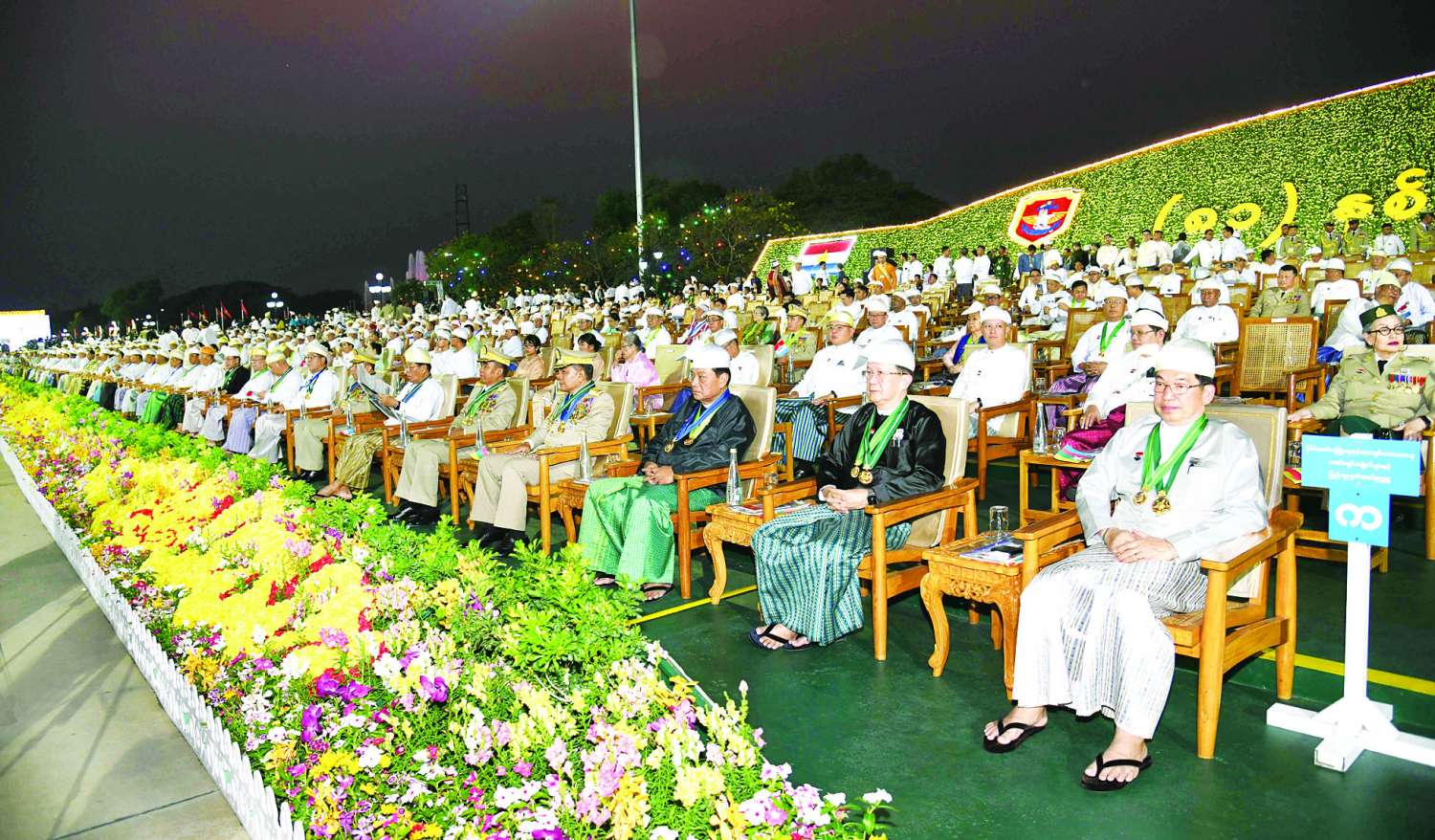 ဆက်လက်၍ နိုင်ငံတော်လုံခြုံရေးနှင့် အေးချမ်းသာယာရေးကော်မရှင်ဥက္ကဋ္ဌ တပ်မတော်ကာကွယ်ရေးဦးစီးချုပ်၊ စစ်ရေးပြစစ်ကြောင်းကြီးများမှ တပ်မတော်သားများနှင့် မြန်မာနိုင်ငံရဲတပ်ဖွဲ့ဝင်များက နိုင်ငံတော်အလံနှင့် ကျဆုံးလေပြီးသော တပ်မတော်သားများအား အလေးပြုကြပြီး သစ္စာလေးချက်ကို သံပြိုင်ရွတ်ဆိုကြသည်။