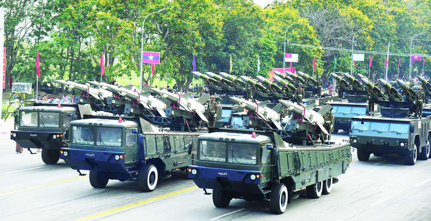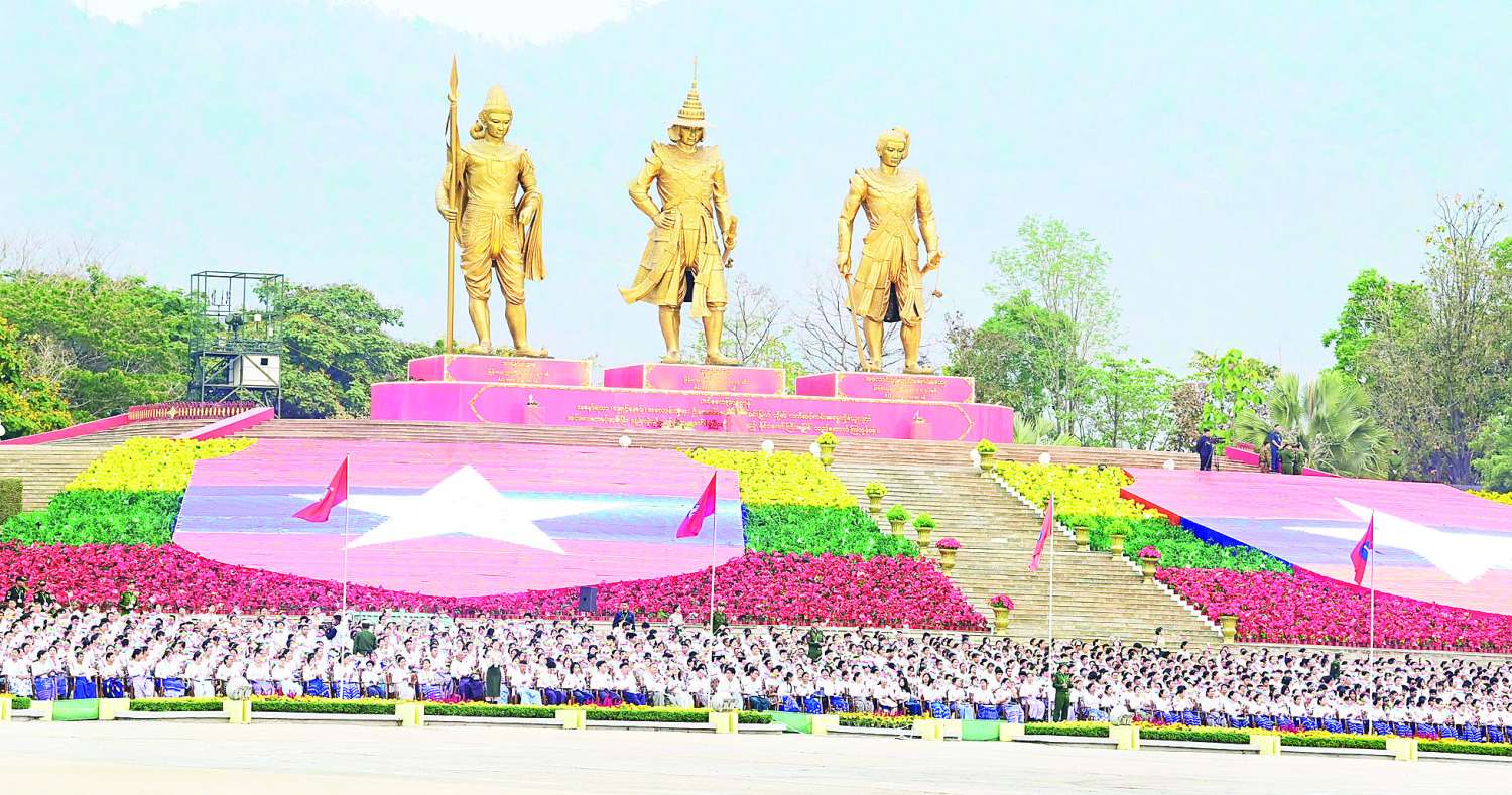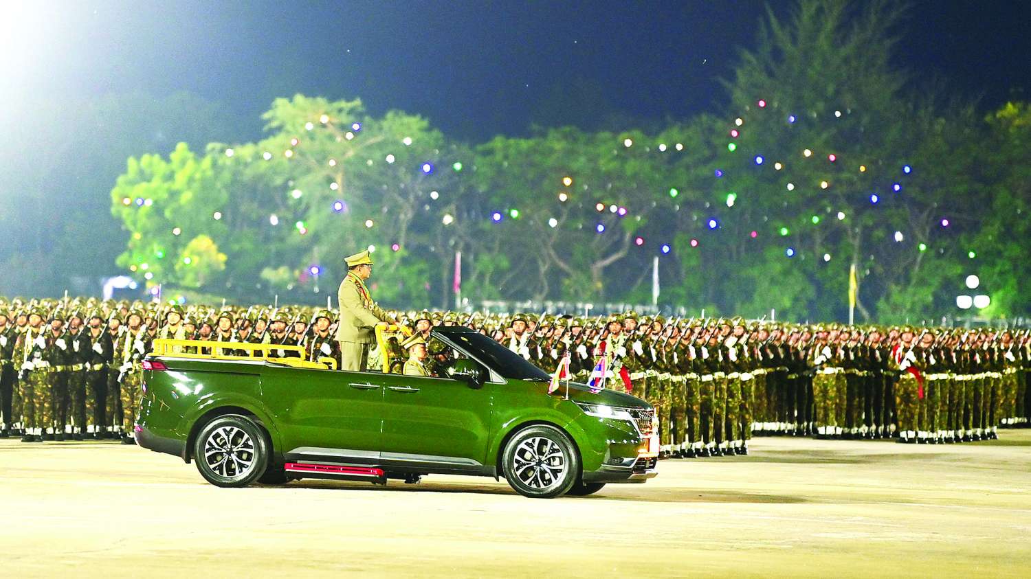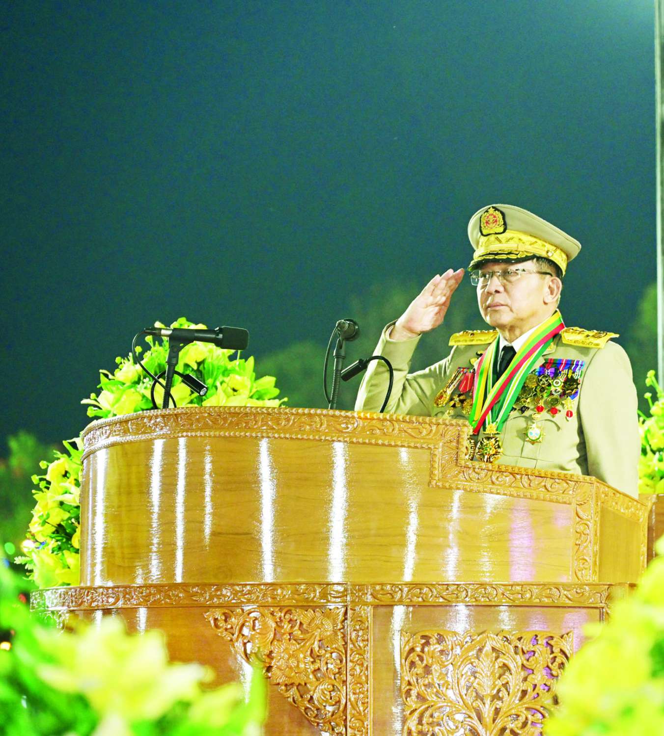 (၈၁) နှစ်မြောက် တပ်မတော်နေ့စစ်ရေးပြအခမ်းအနားကို ယနေ့ညပိုင်းတွင် နေပြည်တော်စစ်ရေးပြကွင်း၌ ကျင်းပပြုလုပ်ရာ နိုင်ငံတော်လုံခြုံရေးနှင့် အေးချမ်းသာယာရေးကော်မရှင်ဥက္ကဋ္ဌ တပ်မတော်ကာကွယ်ရေးဦးစီးချုပ် ဗိုလ်ချုပ်မှူးကြီး သတိုးမဟာသရေစည်သူ သတိုးသီရိသုဓမ္မ မင်းအောင်လှိုင် တက်ရောက်မိန့်ခွန်းပြောကြားသည်။