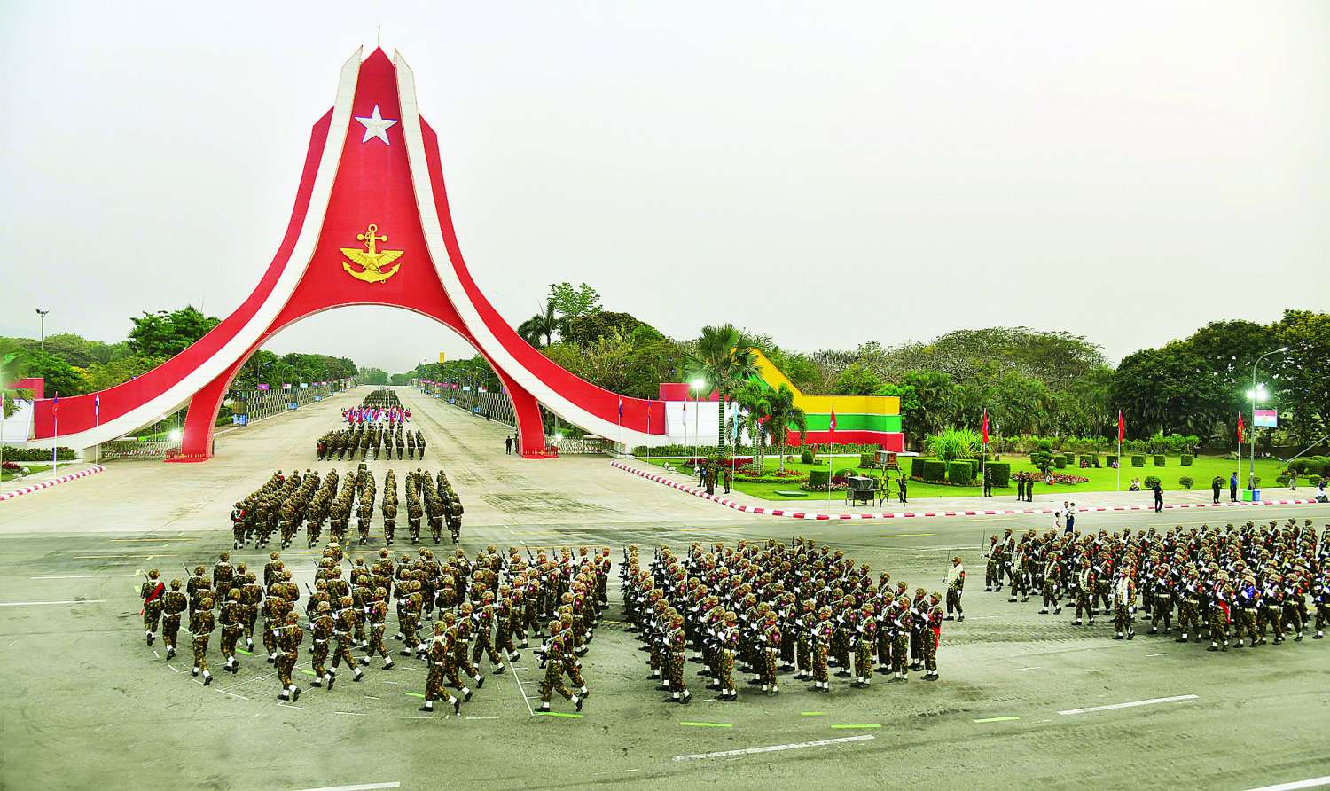 ယင်းနောက် နိုင်ငံတော်လုံခြုံရေးနှင့် အေးချမ်းသာယာရေးကော်မရှင်ဥက္ကဋ္ဌ တပ်မတော်ကာကွယ်ရေးဦးစီးချုပ် ဗိုလ်ချုပ်မှူးကြီး သတိုးမဟာသရေစည်သူ သတိုးသီရိသုဓမ္မ မင်းအောင်လှိုင်အား စစ်ရေးပြမှူးကြီး ဗိုလ်ချုပ် ရဲရင့်ဝင်း ဦးဆောင်သော စစ်ကြောင်းကြီးများမှ တပ်မတော်သားများ၊ မြန်မာနိုင်ငံရဲတပ်ဖွဲ့ဝင်များက အစီအစဉ်အတိုင်း စစ်ကြောင်းပုံဖြင့် ညီညာစွာချီတက်အလေးပြုကြပြီး စစ်ရေးပြကွင်းကြီးအတွင်းမှ ပြန်လည်ထွက်ခွာကြသည်။