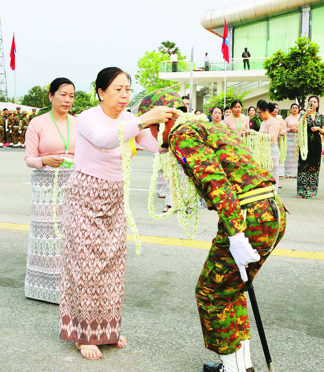ထိုသို့ ချီတက်ချိန်တွင် နိုင်ငံတော်လုံခြုံရေးနှင့် အေးချမ်းသာယာရေးကော်မရှင် တပ်မတော်ကာကွယ်ရေးဦးစီးချုပ်၏ ဇနီးဒေါ်ကြူကြူလှ၊ ကော်မရှင်အတွင်းရေးမှူး ကာကွယ်ရေးဦးစီးချုပ် (ကြည်း) ၏ ဇနီး၊ ကော်မရှင်အဖွဲ့ဝင်ညှိနှိုင်းကွပ်ကဲရေးမှူး (ကြည်း၊ ရေ၊ လေ) ၏ ဇနီး၊ ကာကွယ်ရေးဦးစီးချုပ် (ရေ) ၏ ဇနီး၊ ကာကွယ်ရေးဦးစီးချုပ် (လေ) ၏ ဇနီး၊ ကာကွယ်ရေးဦးစီးချုပ်ရုံးမှ တပ်မတော်အရာရှိကြီးများ၏ ဇနီးများက ဂုဏ်ပြုပန်းကုံးများစွပ်၍ ကြိုဆိုကြသည်။