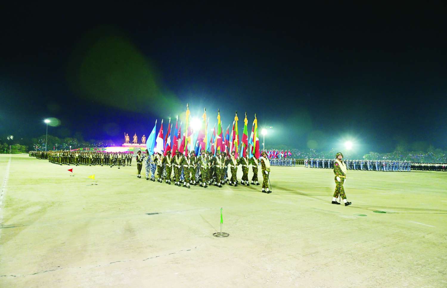 (၈၁) နှစ်မြောက် တပ်မတော်နေ့စစ်ရေးပြကျင်းပသော နေပြည်တော်စစ်ရေးပြ ကွင်းကြီးတွင်ခံ့ညားစွာ စိုက်ထူထားသည့် ပထမ၊ ဒုတိယနှင့် တတိယမြန်မာနိုင်ငံတော်တို့ကို တည်ထောင်ခဲ့ကြသော မင်းသုံးပါးတို့၏ ကြေးရုပ်တုကြီးများကိုလည်းကောင်း၊ တပ်မတော်နေ့ မီးရှူးတိုင်နှင့် (၈၁) နှစ်မြောက် တပ်မတော်နေ့အထိမ်းအမှတ်တံဆိပ်ကြီးကိုလည်းကောင်း ဝင့်ထည်စွာတွေ့မြင်နိုင်သည့်အပြင် ဗမာ့လွတ်လပ်ရေးတပ်မတော်အလံ၊ ဗမာ့ကာကွယ်ရေးတပ်မတော်အလံ၊ တပ်မတော် (ကြည်း၊ ရေ၊ လေ) အလံများ၊ ကာကွယ်ရေးဦးစီးချုပ်ရုံး (ကြည်း) ညွှန်ကြားရေးမှူးရုံးအလံများ၊ တိုင်းစစ်ဌာနချုပ်၊ တပ်မဌာနချုပ်အသီးသီးနှင့် တပ်ရင်းတပ်ဖွဲ့များ၏ အမှတ်တံဆိပ်ပါရောင်စုံအလံများ တလွင့်လွင့်လွှင့်ထူထားကြသည်ကိုလည်း တွေ့မြင်နိုင်မည်ဖြစ်ပြီး စစ်ကြောင်းကြီးများ ချီတက်ရာလမ်းကြောင်း တစ်လျှောက်၌ စစ်ကြောင်းများ၏ ကိုယ်စားပြုအရောင်အလှမီးများ၊ မီးအလှထွန်းသည့် Truss Beam များ၊ မီးဆိုင်းများ၊ Light Box များ၊ Lighting Pole များဖြင့်လည်းကောင်း၊ စစ်ရေးပြကွင်းကြီး၏ အဝင်မုခ်ဦးတွင် LED Strip Light များအသုံးပြု၍ စစ်ကြောင်းကြီးများ၏ ကိုယ်စားပြုအရောင်များအတိုင်း ပြောင်းလဲအလှဆင်၍လည်းကောင်း၊ လမ်းဘေးဝဲယာတစ်လျှောက်၌လည်း မိုးစက်မီးများ၊ Up Light များ၊ Program LED Strip Light များ၊ ရောင်စုံအလှမီးများဖြင့် ဆင်ယင်ထားပြီး စစ်ကြောင်းကြီးများအား ဂုဏ်ပြုကြိုဆိုပါ၏ စာတန်းများ၊ နိုင်ငံတော်အလံနှင့် တပ်မတော် (ကြည်း၊ ရေ၊ လေ) အလံများကို Lighting Effect မီးအလှများဖြင့် ပုံဖော်၍လည်းကောင်း၊ စစ်ရေးပြကွင်းအတွင်း အလေးပြုခံစင်မြင့် မျက်နှာမူရာရှိသစ်ပင်များ၌လည်း Handmade အလှမီးများဖြင့်လည်းကောင်း၊ မင်းကြီးသုံးပါးရုပ်တုအောက်ခံ၌ တပ်မတော်အလံပုံဖော်ထားသည့် ကြယ်တံဆိပ်နှစ်ခုအား LED Strip Light များဖြင့်လည်းကောင်း၊ နိုင်ငံတော်လုံခြုံရေးနှင့် အေးချမ်းသာယာရေးကော်မရှင်ဥက္ကဋ္ဌ တပ်မတော်ကာကွယ်ရေးဦးစီးချုပ် ဗိုလ်ချုပ်မှူးကြီး သတိုးမဟာသရေစည်သူ သတိုးသီရိသုဓမ္မ မင်းအောင်လှိုင် ပြန်လည်ထွက်ခွာမည့် လမ်းတစ်လျှောက်တွင်လည်း Flag Light Box များ၊ LED Strip Light များဖြင့် အသီးသီးပုံဖော်အလှဆင်ထားသည်ကို တွေ့မြင်နိုင်မည်ဖြစ်သည်။