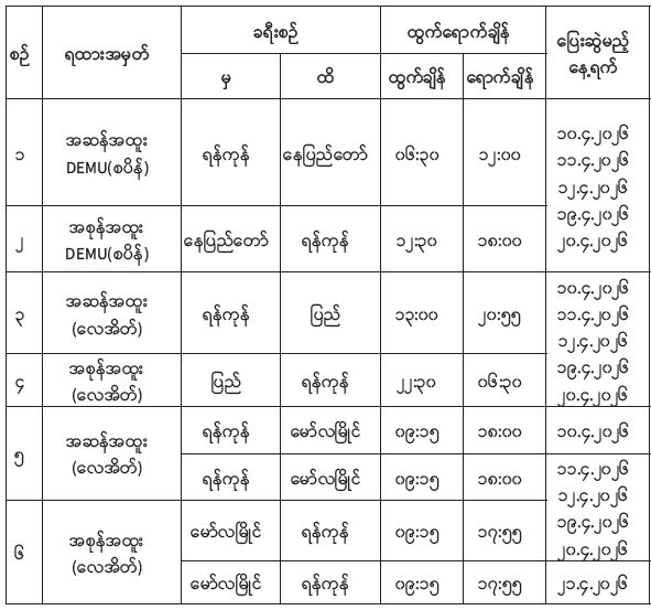 ထို့အတူ ရန်ကုန်မြို့ပတ်ရထားများကိုလည်း ဧပြီလ ၁၃ ရက်နေ့မှ ၁၆ ရက်နေ့အထိ ခေတ္တရပ်နားထားမည်ဖြစ်သည်။