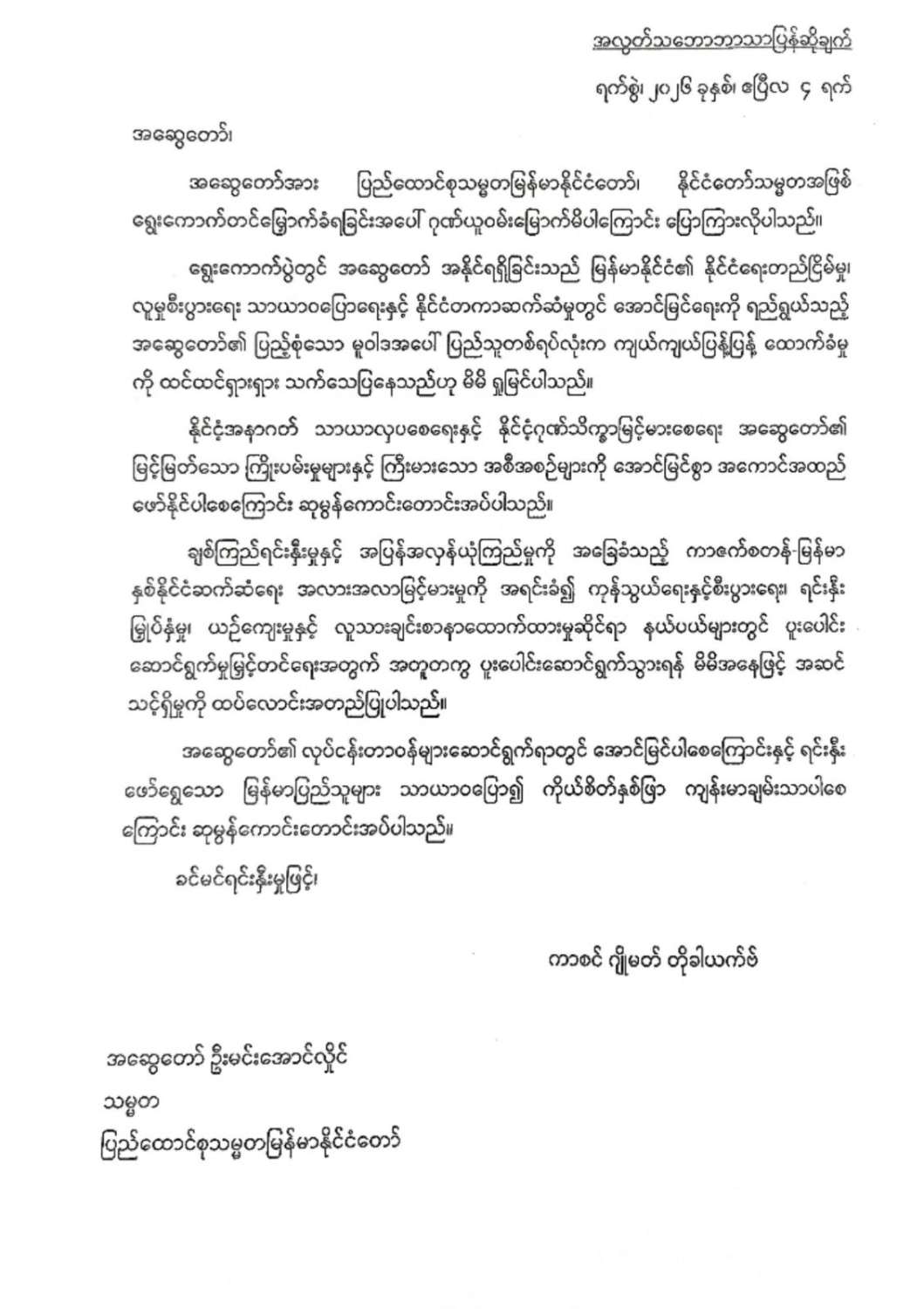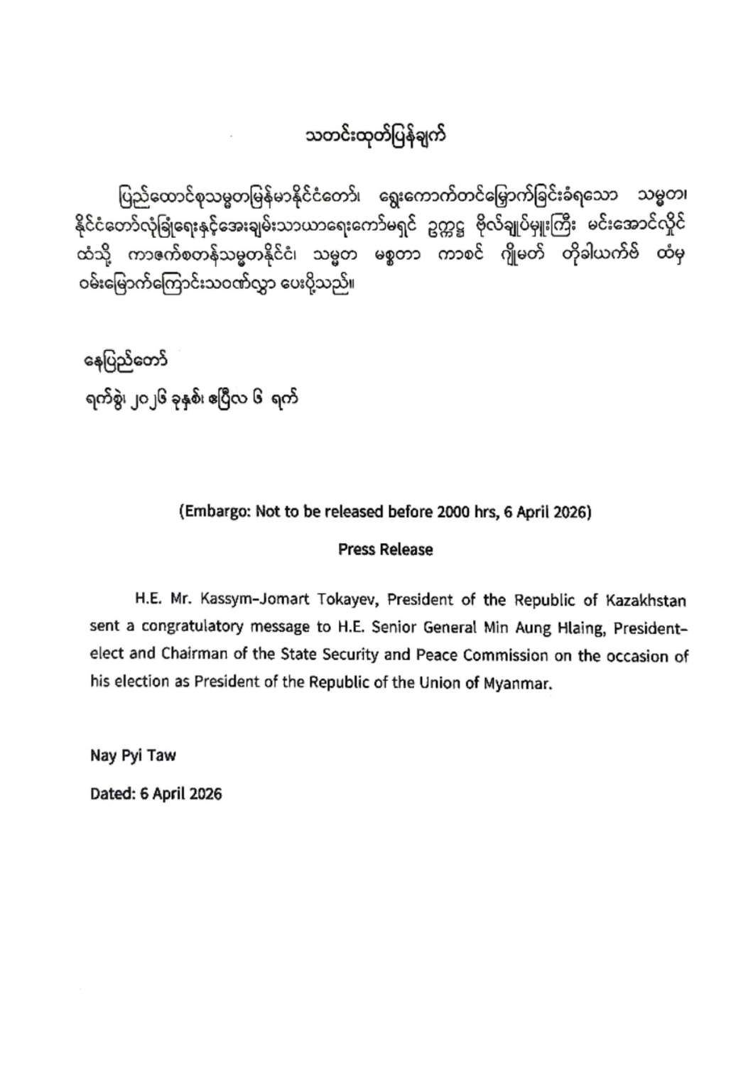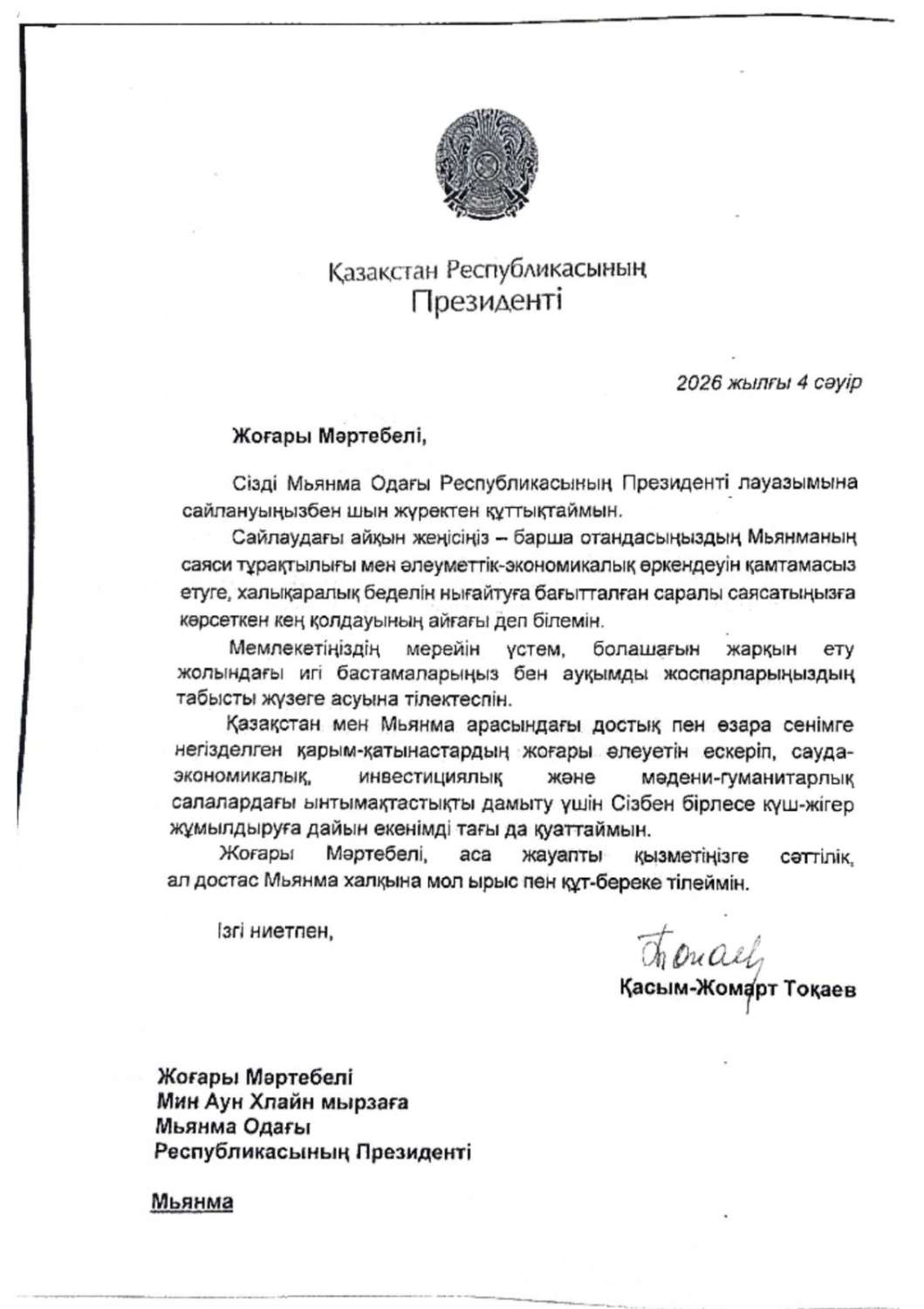 ပြည်ထောင်စုသမ္မတမြန်မာနိုင်ငံတော်၊ ရွေးကောက်တင်မြှောက်ခြင်းခံရသော သမ္မတ၊ နိုင်ငံတော်လုံခြုံရေးနှင့်အေးချမ်းသာယာရေးကော်မရှင်ဥက္ကဋ္ဌ ဗိုလ်ချုပ်မှူးကြီး မင်းအောင်လှိုင်ထံသို့ ကာဇက်စတန်သမ္မတနိုင်ငံသမ္မတ မစ္စတာ ကာစင်ဂျိုမတ် တိုခါယက်ဗ်ထံမှ ဝမ်းမြောက်ကြောင်းသဝဏ်လွှာ ပေးပို့