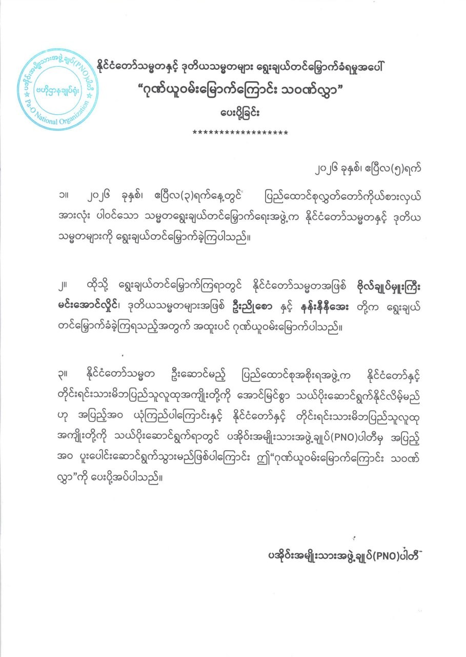 ၂၀၂၆ ခုနှစ်၊ ဧပြီလ ၃ ရက်တွင် ကျင်းပသည့် နိုင်ငံတော်သမ္မတရွေးချယ်တင်မြှောက်ပွဲ၌ ပြည်ထောင်စုလွှတ်တော်ကိုယ်စားလှယ် အားလုံးပါဝင်သော နိုင်ငံတော်သမ္မတ ရွေးချယ်တင်မြှောက်ရေးအဖွဲ့က ရွေးကောက်ခံ ပြည်သူ့လွှတ်တော်ကိုယ်စားလှယ်များ အစုအဖွဲ့မှ ဒုတိယသမ္မတအဖြစ် ရွေးချယ်တင်မြှောက်ထားသော ဗိုလ်ချုပ်မှူးကြီး မင်းအောင်လှိုင်အား နိုင်ငံတော်သမ္မတအဖြစ် ရွေးချယ်တင်မြှောက်ခြင်းခံရသည့်အတွက် အမျိုးသားဒီမိုကရေစီပါတီသစ်၊ ဗိုလ်တထောင်ကျိုက်ဒေးအပ်ဆံတော်ဦးစေတီတော် ဘဏ္ဍာတော်ထိန်းဂေါပကအဖွဲ့၊ တရုတ်-မြန်မာစီးပွားပူးပေါင်းဆောင်ရွက်ရေးနှင့်ဖွံ့ဖြိုးမှုမြှင့်တင်ရေးအသင်း (CMECDPA) ၊ မြန်မာ-ဂျပန်ချစ်ကြည်ရေးအသင်း၊ မြန်မာနိုင်ငံအမျိုးသမီးများနှင့် ကလေးသူငယ်များဘဝမြှင့်တင်ရေးအသင်း၊ မြန်မာ-ရုရှား ချစ်ကြည်ရေးအသင်း၊ မြန်မာ့ငြိမ်းချမ်းရေးနှင့်ဆင်းရဲနွမ်းပါးမှုလျော့ပါးရေးအဖွဲ့ (MPPAA) ၊ မြန်မာနိုင်ငံဆိုင်ရာ ဟူနန်ကုန်သည်ကြီးများအသင်း၊ မြန်မာနိုင်ငံဆိုင်ရာ စီချွမ်နှင့်ချုံချင့် ကုန်သည်ကြီးများအသင်းချုပ်၊ မြန်မာနိုင်ငံဆိုင်ရာ ကျန်းစုကုန်သည်ကြီးများအသင်း၊ မြန်မာနိုင်ငံဆိုင်ရာရှန်ဒုန်ကုန်သည်ကြီးများအသင်း၊ မြန်မာနိုင်ငံဆိုင်ရာကျန်းရှီးကုန်သည်ကြီးများအသင်းချုပ်၊ မြန်မာနိုင်ငံဆိုင်ရာ ဖုကျန့်ကုန်သည်ကြီးများအသင်းချုပ်၊ မြန်မာနိုင်ငံဆိုင်ရာ ကွမ်းတုန်းကုန်သည်ကြီးများအသင်းနှင့် မြန်မာနိုင်ငံဆိုင်ရာ(တရုတ်) ယူနန် ကုန်သည်ကြီးများအသင်းတို့က အထူးဂုဏ်ယူဝမ်းမြောက်ကြောင်း ကြေညာချက်များ ထုတ်ပြန်ခဲ့ကြသည်။