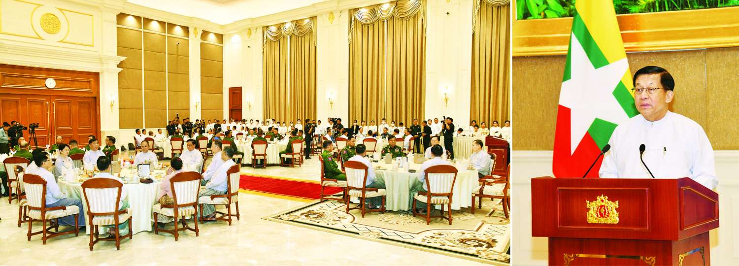 ဦးစွာ ရွေးကောက်တင်မြှောက်ခြင်းခံရသော သမ္မတ နိုင်ငံတော်လုံခြုံရေးနှင့် အေးချမ်းသာယာရေးကော်မရှင်ဥက္ကဋ္ဌက အမှာစကားပြောကြားရာတွင် မိမိဦးဆောင်သည့် တပ်မတော်အနေဖြင့် ၂၀၂၀ ပြည့်နှစ်၊ ရွေးကောက်ပွဲမသမာမှုများကြောင့် အရေးပေါ်ကာလသတ်မှတ်ပြီး အခြေခံဥပဒေနှင့်အညီ နိုင်ငံတော်က တာဝန်ပေးခဲ့သောကြောင့် ၂၀၂၁ ခုနှစ်၊ ဖေဖော်ဝါရီလ (၁) ရက်နေ့မှ ယခုအထိ နိုင်ငံ့တာဝန်ကို ထိန်းသိမ်းဆောင်ရွက်လျက်ရှိကြောင်း၊ နိုင်ငံတော်တာဝန်ကို စတင်ယူခဲ့ချိန်မှစပြီး အခက်အခဲနှင့် စိန်ခေါ်မှုများစွာ ကြုံတွေ့ခဲ့ရသည်ကို မိမိနှင့်အတူ ကော်မရှင်အဖွဲ့ဝင်များ၊ အစိုးရအဖွဲ့ဝင်များနှင့် တပ်မတော်သားများ ပူးပေါင်းပြီး ပြည်သူလူထုအားဖြင့် ရင်ဆိုင်ကျော်လွှားနိုင်ခဲ့ကြသည်မှာ အားလုံးအသိပင်ဖြစ်ကြောင်း။