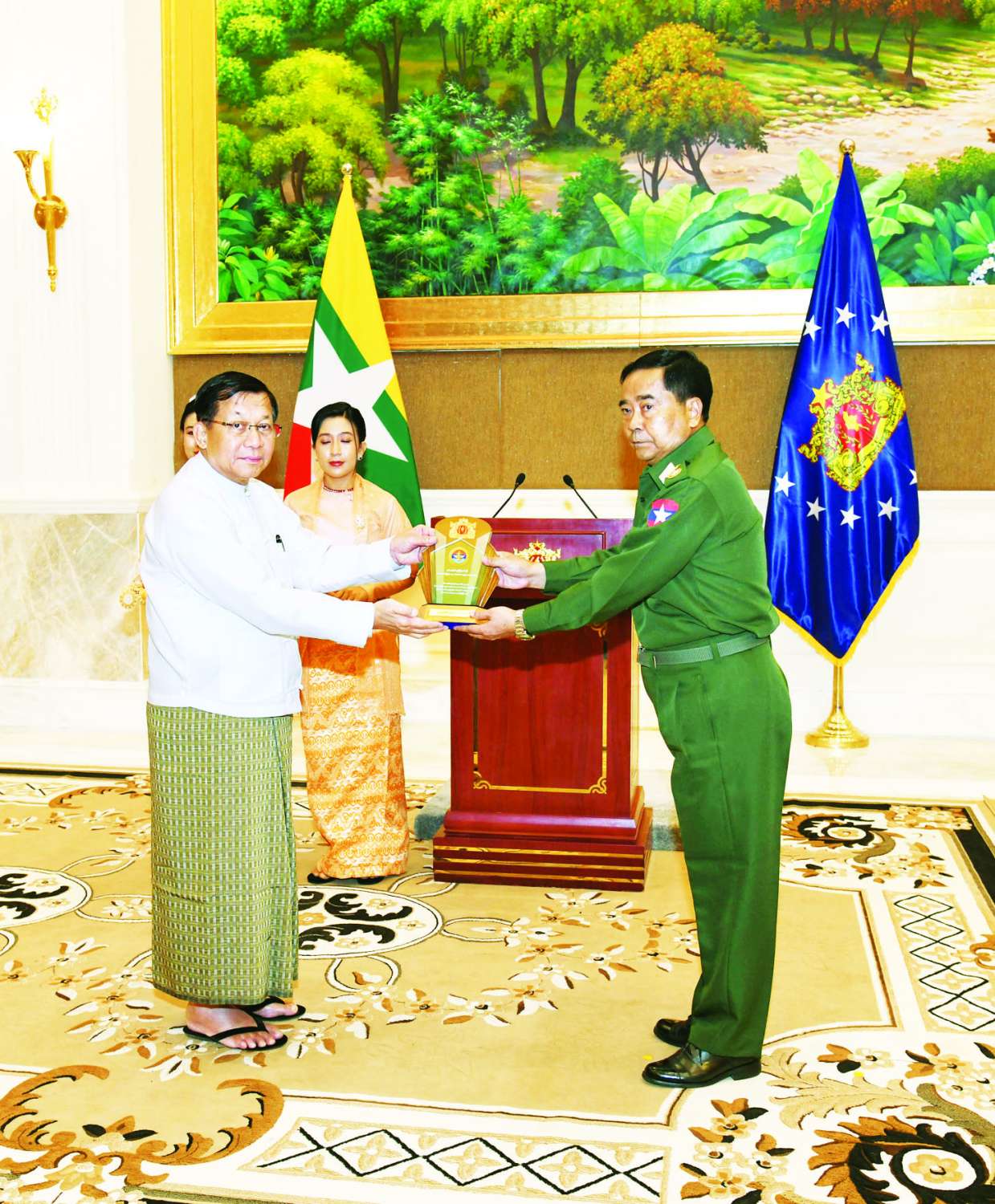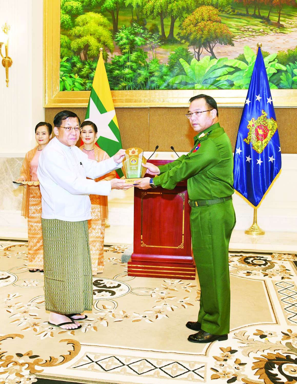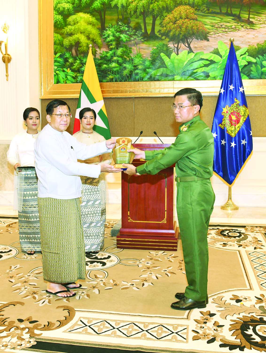 ထို့နောက် ရွေးကောက်တင်မြှောက်ခြင်းခံရသော သမ္မတ နိုင်ငံတော်လုံခြုံရေးနှင့် အေးချမ်းသာယာရေးကော်မရှင်ဥက္ကဋ္ဌ ဗိုလ်ချုပ်မှူးကြီး မင်းအောင်လှိုင်က ကော်မရှင်အဖွဲ့ဝင်များဖြစ်ကြသည့် ဗိုလ်ချုပ်ကြီး မောင်မောင်အေး၊ ဒုတိယဗိုလ်ချုပ်ကြီး ဖုန်းမြတ်၊ ဒုတိယဗိုလ်ချုပ်ကြီး ရာပြည့်၊ ဗိုလ်ချုပ်ကြီး ကျော်စွာလင်း၊ စက်မှုဝန်ကြီးဌာန ပြည်ထောင်စုဝန်ကြီး ဒေါက်တာ ချာလီသန်းနှင့် ကာကွယ်ရေးဦးစီးချုပ်ရုံးမှ အဆင့်မြင့်တပ်မတော်အရာရှိကြီးများ၊ အငြိမ်းစားအဆင့်မြင့်တပ်မတော်အရာရှိကြီးများအား ဂုဏ်ပြုအထိမ်းအမှတ်လက်ဆောင်များ ပေးအပ်ချီးမြှင့်သည်။