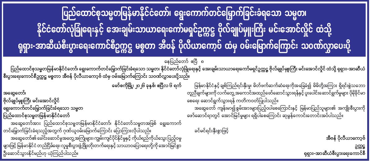 ပြည်ထောင်စုသမ္မတမြန်မာနိုင်ငံတော်၊ ရွေးကောက်တင်မြှောက်ခြင်းခံရသော သမ္မတ၊ နိုင်ငံတော်လုံခြုံရေးနှင့် အေးချမ်းသာယာရေးကော်မရှင်ဥက္ကဋ္ဌ ဗိုလ်ချုပ်မှူးကြီး မင်းအောင်လှိုင်ထံသို့ ရုရှား-အာဆီယံစီးပွားရေးကောင်စီဥက္ကဋ္ဌ မစ္စတာ အီဗန်ပိုလီယာကော့ဗ်ထံမှ ဝမ်းမြောက်ကြောင်း သဝဏ်လွှာပေးပို့