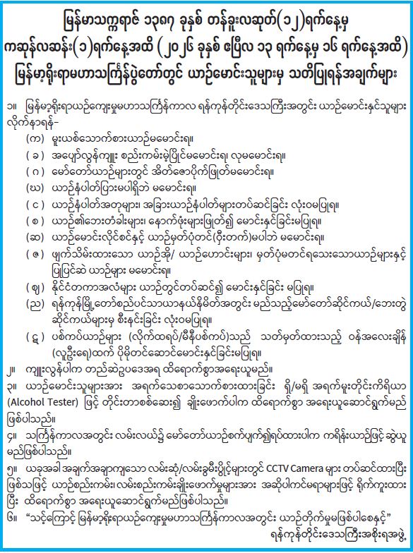 မြန်မာသက္ကရာဇ် ၁၃၈၇ ခုနှစ် တန်ခူးလဆုတ် (၁၂) ရက်နေ့မှ ကဆုန်လဆန်း (၁) ရက်နေ့အထိ (၂၀၂၆ ခုနှစ် ဧပြီလ ၁၃ ရက်နေ့မှ ၁၆ ရက်နေ့အထိ) မြန်မာ့ရိုးရာမဟာသင်္ကြန်ပွဲတော်တွင် ယာဉ်မောင်းသူများမှ သတိပြုရန်အချက်များ