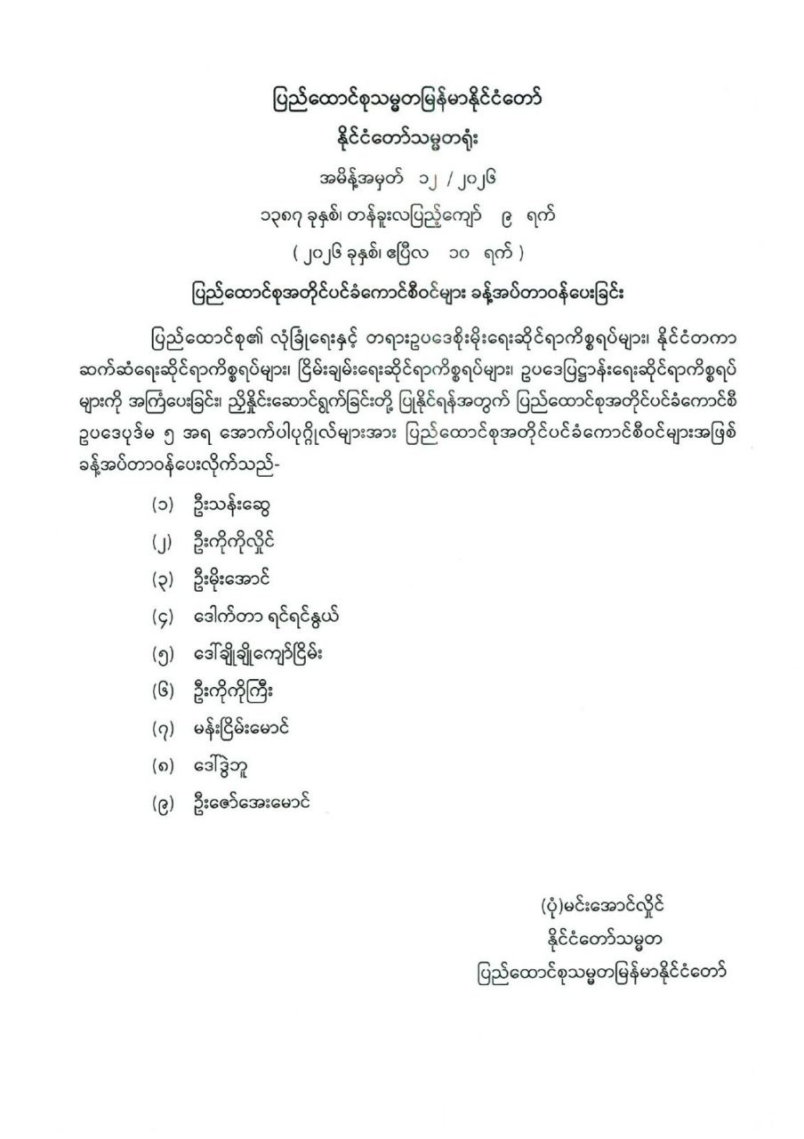 ပြည်ထောင်စုအတိုင်ပင်ခံကောင်စီဝင်များ ခန့်အပ်တာဝန်ပေးခြင်း