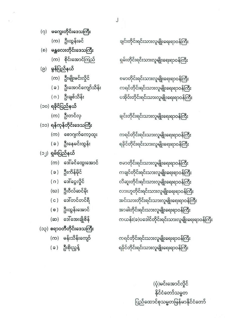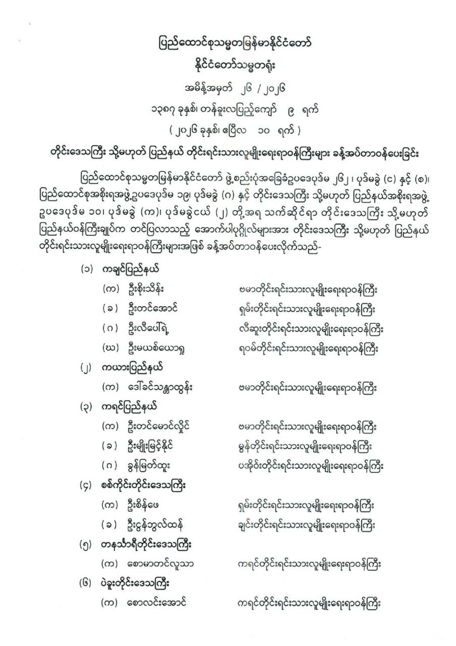 တိုင်းဒေသကြီး သို့မဟုတ် ပြည်နယ်တိုင်းရင်းသားလူမျိုးရေးရာဝန်ကြီးများ ခန့်အပ်တာဝန်ပေးခြင်း