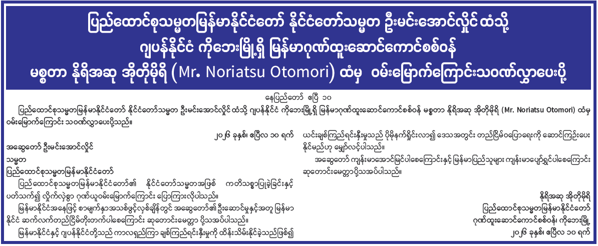 ပြည်ထောင်စုသမ္မတမြန်မာနိုင်ငံတော် နိုင်ငံတော်သမ္မတ ဦးမင်းအောင်လှိုင် ထံသို့ ဂျပန်နိုင်ငံ ကိုဘေးမြို့ရှိ မြန်မာဂုဏ်ထူးဆောင်ကောင်စစ်ဝန် မစ္စတာ နိုရိအဆု အိုတိုမိုရိ (Mr. Noriatsu Otomori) ထံမှ ဝမ်းမြောက်ကြောင်းသဝဏ်လွှာပေးပို့ 04/11/2026