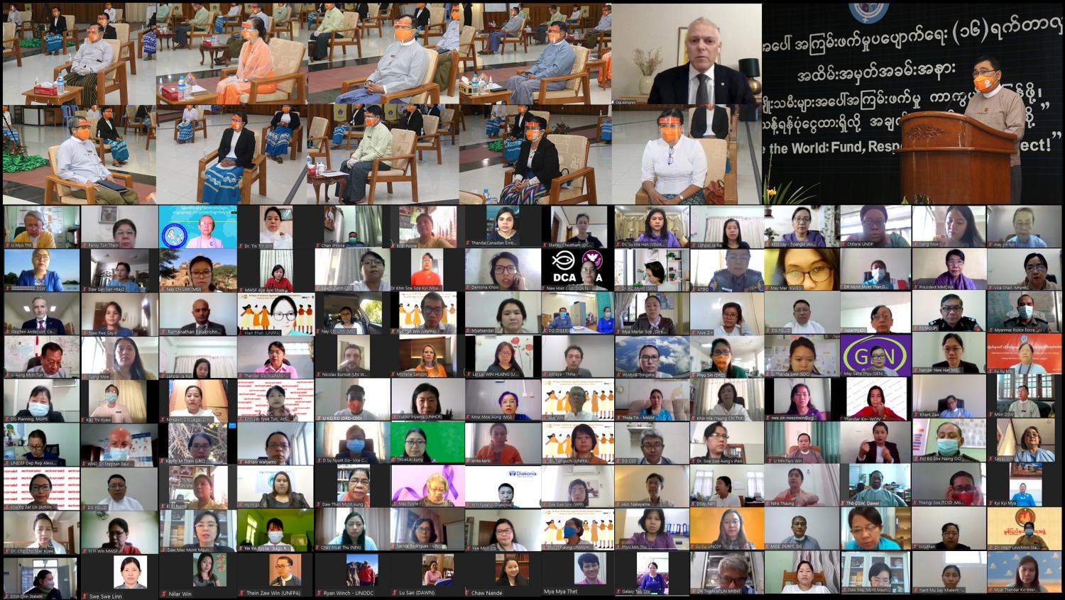 အမျိုးသမီးများအပေါ် အကြမ်းဖက်မှု ပပျောက်ရေး (၁၆) ရက်တာလှုပ်ရှားမှု အထိမ်း အမှတ်အခမ်း အနားကို ယနေ့နံနက်ပိုင်းတွင် လူမှု၀န်ထမ်း၊ ကယ်ဆယ်ရေးနှင့် ပြန်လည်နေရာ ချထားရေး၀န်ကြီးဌာန၌ ဗီဒီယိုကွန်ဖရင့်စနစ်ဖြင့် ကျင်းပသည်။