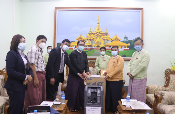 ပဲခူးတိုင်းဒေသကြီးအစိုးရအဖွဲ့ရုံး၊ ဝန်ကြီးချုပ်၏ ဧည့်ခန်းမသို့ ဒီဇင်ဘာ ၁၀ ရက် ညနေ ၆ နာရီက ZEN Holdings, UNIHO TOMOSADA Co., Ltd မှ Oxygen Concentrator (၂)လုံး လာရောက် လှူဒါန်းခဲ့သည်။