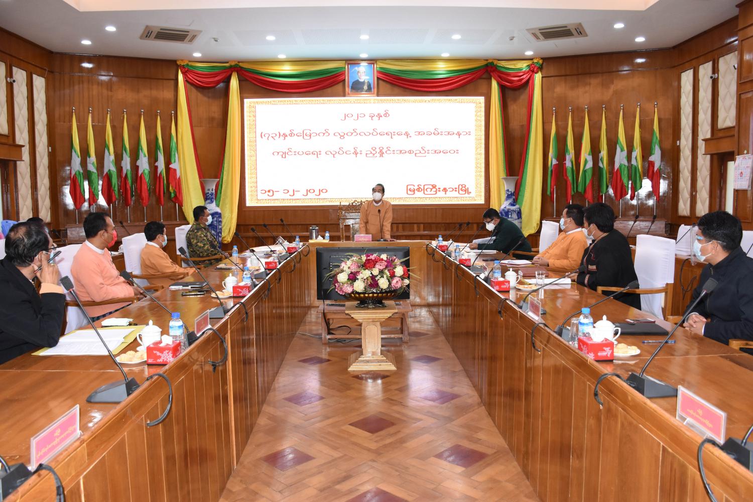 ယင်းနောက် ၂၀၂၁ ခုနှစ် (၇၃)နှစ်မြောက် လွတ်လပ်ရေးနေ့ကျင်းပရေး ဦးစီးကော်မတီဝင် ပြည်နယ်ဝန်ကြီးများ၊ လုပ်ငန်းကော်မတီဝင် ပြည်နယ်အစိုးရအဖွဲ့ညွှန်ကြားရေးမှူးနှင့် ပြည်နယ်အဆင့် ဌာနဆိုင်ရာများက အခမ်းအနား ကျင်းပပြုလုပ်နိုင်ရေးအတွက် ကိုဗစ်-၁၉ ရောဂါကာကွယ်၊ ထိန်းချုပ်ရေးညွှန်ကြားချက်များ၊ ဆောင်ရွက်ရမည့် စံလုပ်ငန်း လမ်းညွှန်ချက်များနှင့်အညီ လူဦးရေအကန့်အသတ်ဖြင့် ဖိတ်ကြားနိုင်ရေး ညှိနှိုင်းဆွေးနွေး တင်ပြမှုများအပေါ် ပြည်နယ် ဝန်ကြီးချုပ်က အခမ်းအနားကို ကိုဗစ်-၁၉ ကာကွယ်၊ ထိန်းချုပ်ရေးညွှန်ကြားချက်၊ ဆောင်ရွက် ရမည့် စံလုပ်ငန်းလမ်း ညွှန်ချက်များနှင့် အညီ ကျင်းပပြုလုပ်သွားရန် ညှိနှိုင်းဆောင်ရွက်ပေးခဲ့သည်။