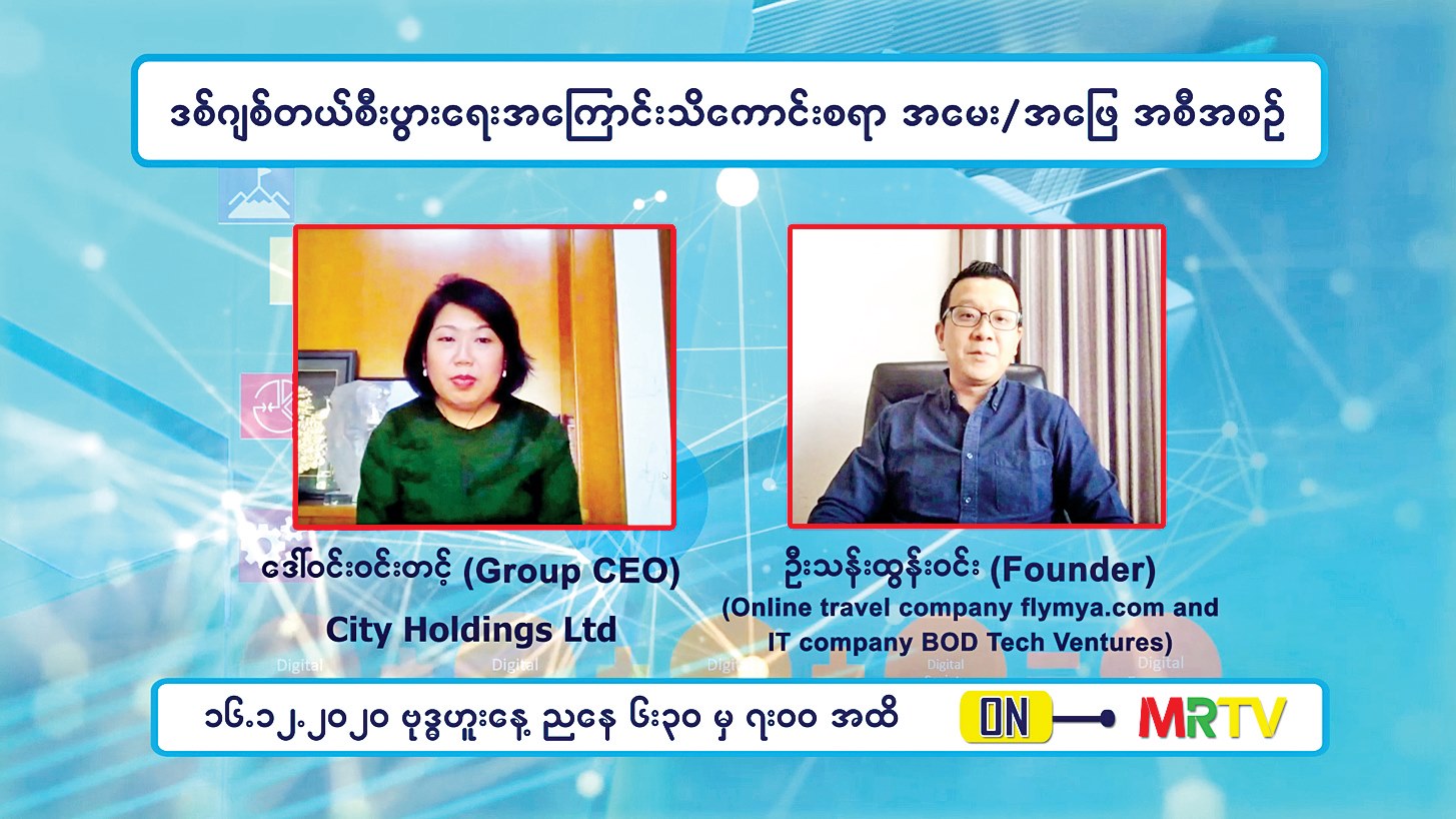ဒီဇင်ဘာ ၁၆ ရက်(ဗုဒ္ဓဟူးနေ့) ညနေတွင် ဒစ်ဂျစ်တယ်နည်းပညာဖြစ် သည့် E-Commerce စနစ်ကိုသုံးပြီး ကုန်စည် စီးဆင်းမှု၊ ဝန်ဆောင်မှု လုပ်ငန်းများနှင့်ပတ်သက်ပြီး ဗဟုသုတမျှဝေပေးမည့် ဒစ်ဂျစ်တယ် စီးပွားရေး အကြောင်း သိကောင်းစရာအစီအစဉ်အား City Holdings Ltd (Group CEO) ဒေါ်ဝင်းဝင်းတင့်နှင့် Online travel Company flymya.com and IT Company BOD Tech Ventures (Founder) ဦးသန်းထွန်းဝင်း တို့က ဆွေးနွေး ကြမည်ဖြစ်ရာ ၎င်းဆွေးနွေးချက်များကို ညနေ ၆ နာရီခွဲ တွင် ထုတ်လွှင့် သွားမည်ဖြစ် ကြောင်း သိရသည်။