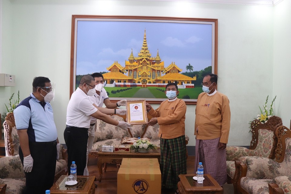 ရှေးဦးစွာ Max-Highway Co., Ltd (ဧရာဝတီဖောင်ဒေးရှင်း)မှ ကိုဗစ်-၁၉ ရောဂါ ကာလအတွင်း ပဲခူးတိုင်း ဒေသကြီးအတွင်း ပြန်လည်ဝင်ရောက်လာသည့် ပြည်သူများအတွက် သယ်ယူပို့ဆောင်ရေး လုပ်ငန်းတွင် အသုံးပြုရန် ငွေကျပ်သိန်း(၅၀)နှင့် Mask အခုရေ(၅၀၀၀)အား ထောက်ပံ့လှူဒါန်းခဲ့ရာ၊ ဝန်ကြီးချုပ် ဦးဝင်းသိန်း၊ စီမံကိန်းနှင့်ဘဏ္ဍာရေးဝန်ကြီး ဦးညွန့်ရွှေတို့က လက်ခံရယူခဲ့ပြီး ဂုဏ်ပြုမှတ် တမ်းလွှာ ပြန်လည်ပေးအပ်ကာ ကျေးဇူးတင်စကားပြောကြားခဲ့ကြောင်း သတင်းရရှိသည်။