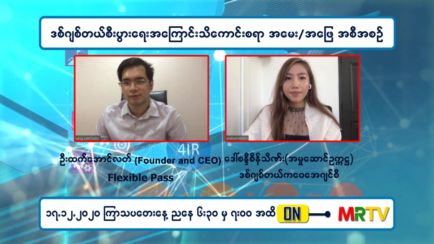 ဒီဇင်ဘာ ၁၇ ရက် (ကြာသပတေးနေ့) ညနေတွင် Digital နည်းပညာဖြစ်သည့် E-Commerce စနစ်ကို သုံး၍ ကုန်စည်နှင့်ဝန်ဆောင်မှုလုပ်ငန်းများ လက်တွေ့ရောင်းချ၊ ဝယ်ယူမှု အခြေအနေနှင့် ပတ်သက်ပြီး ဗဟုသုတမျှဝေပေးမည့် ဒစ်ဂျစ်တယ် စီးပွားရေး အကြောင်း သိကောင်းစရာအစီအစဉ်ကို Flexible Pass (Founder & CEO) ဦးထက်အောင်လတ်နှင့် ဒစ်ဂျစ်တယ်ကဝေအေဂျင်စီ (အမှုဆောင် ဥက္ကဌ) ဒေါ်စန္ဒီစိန် သိဏ်း တို့ က ဆွေးနွေးကြမည်ဖြစ်ရာ ၎င်းဆွေးနွေးချက်များကို ညနေ ၆ နာရီခွဲ တွင် ထုတ်လွှင့် သွားမည် ဖြစ်ကြောင်း သိရသည်။