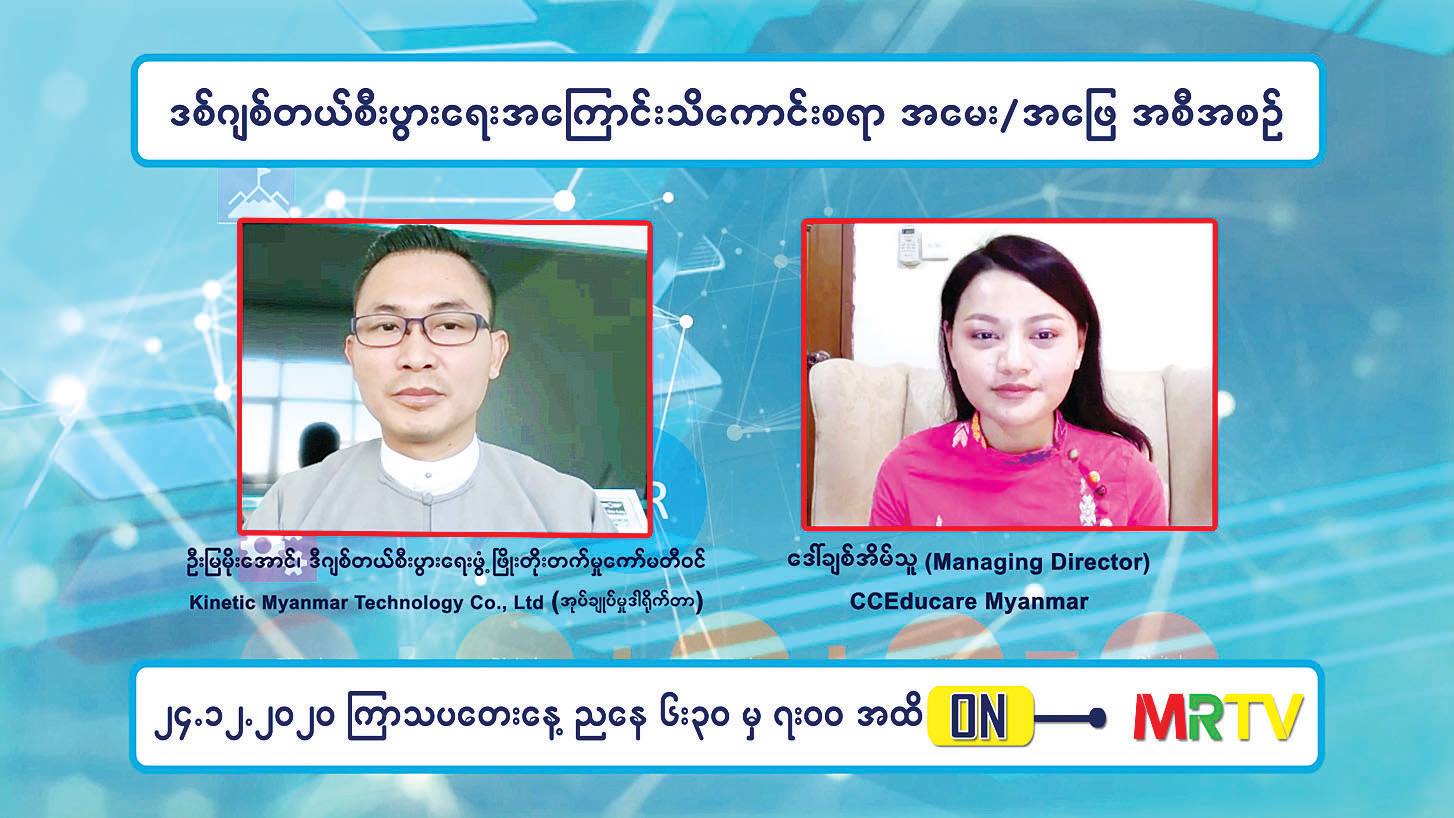 ဒီဇင်ဘာ ၂၄ ရက် (ကြာသပတေးနေ့) ညနေပိုင်းတွင် ဒစ်ဂျစ်တယ် စီးပွားရေး တည်ထောင်နိုင်ရန်  လူ့စွမ်းအားအရင်းအမြစ် ဖွံ့ဖြိုးတိုးတက်မှု၏ အရေးပါပုံများ၊  ပညာရေးနှင့် သင်ကြားရေးတွင် ပြောင်းလဲလာမှုများနှင့်ပတ်သက်ပြီး ဗဟုသုတ မျှဝေပေးမည့်  ဒစ်ဂျစ်တယ်စီးပွားရေးအကြောင်း  သိကောင်းစရာအစီအစဉ်ကို ဒစ်ဂျစ်တယ်စီးပွားရေး   ဖွံ့ဖြိုးတိုးတက်မှုကော်မတီဝင်၊  Kinetic   Myanmar Technology Co.,Ltd၏  (တည်ထောင်သူနှင့်  အုပ်ချုပ်မှုဒါရိုက်တာ)   ဦးမြမိုး အောင်နှင့် CCEducare Myanmar၏ (Managing Director)  ဒေါ်ချစ်အိမ်သူ တို့က   ဆွေးနွေးကြမည်ဖြစ်ရာ ၎င်းဆွေးနွေးချက်များကို ညနေ  ၆  နာရီခွဲတွင် ထုတ်လွှင့်သွားမည်ဖြစ်ကြောင်း သိရသည်။