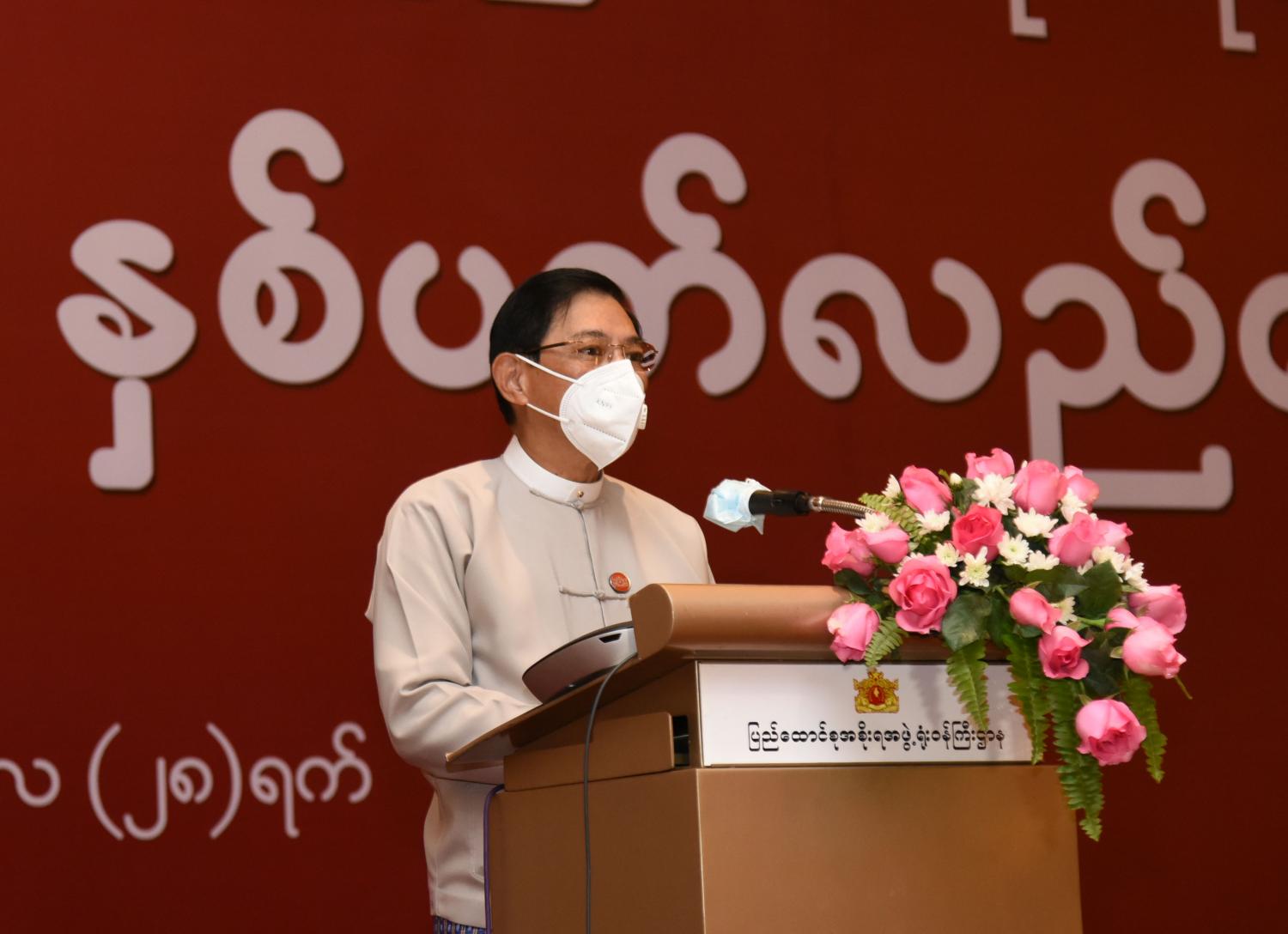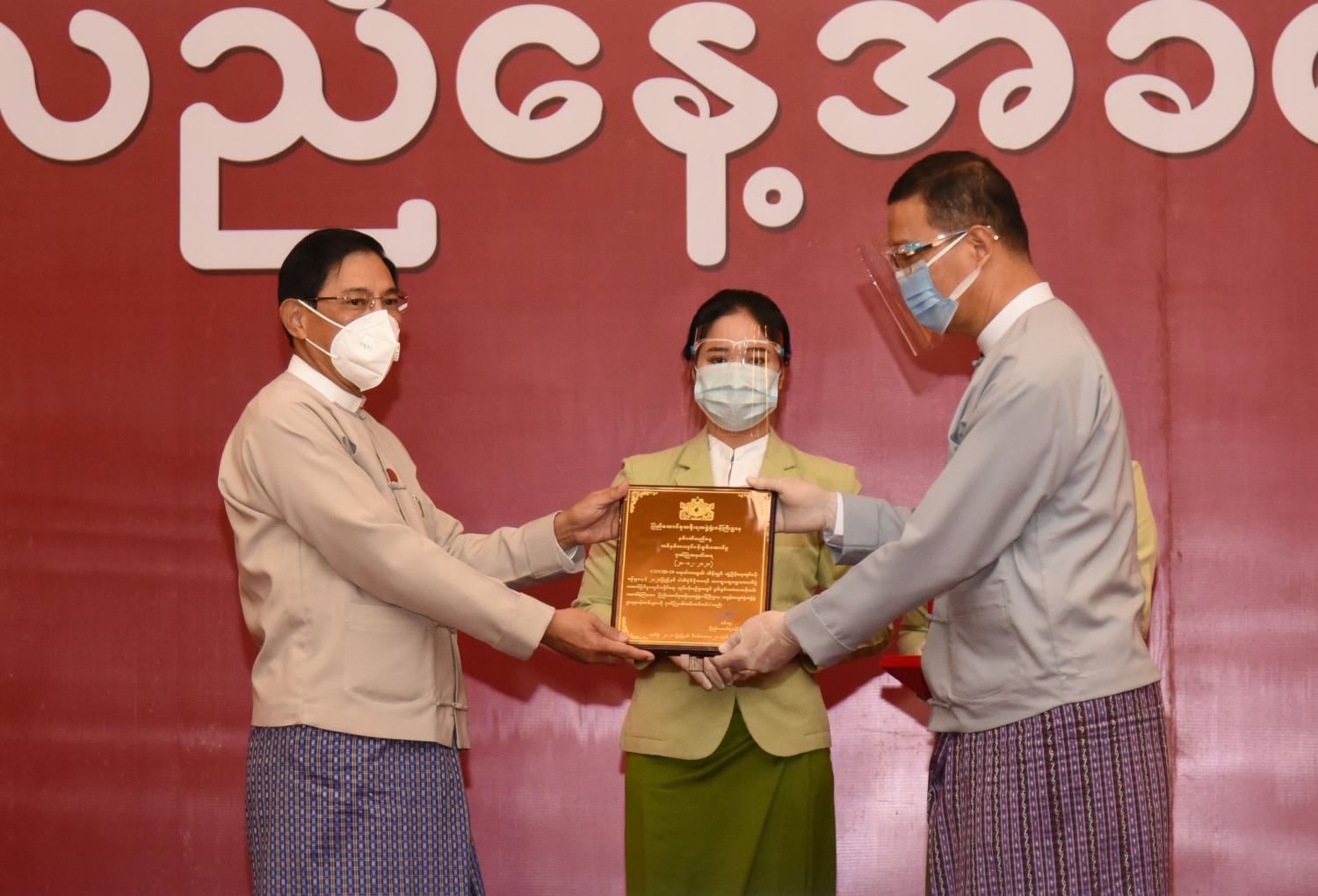 ထို့နောက် ပြည်ထောင်စုဝန်ကြီး ဦးမင်းသူက ကိုဗစ်-၁၉ ရောဂါ ကာကွယ် ထိန်းချုပ်၊ တုံ့ပြန်ရေး လုပ်ငန်းစဉ်များအား စွမ်းစွမ်းတမံ ကူညီဆောင်ရွက်ခဲ့သည့် အစိုးရအဖွဲ့ရေးရာ ဌာနကိုယ်စား ဒုတိယညွှန်ကြားရေးမှူးချုပ် ဦးအောင်စိုးသိန်း ကိုလည်းကောင်း၊ ကိုဗစ်-၁၉ ရောဂါ ကာကွယ်ထိန်းချုပ်၊ တုံ့ပြန်ရေး လုပ်ငန်းစဉ်များနှင့် အထွေထွေရွေးကောက်ပွဲ အောင်မြင်စွာ ကျင်းပပြုလုပ်နိုင်ရေးနှင့် စပ်လျဉ်းသည့် အုပ်ချုပ်ရေးလုပ်ငန်းစဉ်များကို စွမ်းစွမ်းတမံပံ့ပိုးကူညီ ဆောင်ရွက်ခဲ့သည့် အထွေထွေအုပ်ချုပ်ရေးဦးစီးဌာနကိုယ်စား ညွှန်ကြားရေးမှူးချုပ် ဦးမြင့်သန်းကို လည်းကောင်း၊ ကိုဗစ်-၁၉ ရောဂါ ကာကွယ်၊ ထိန်းချုပ်၊ တုံ့ပြန်ရေးလုပ်ငန်းစဉ်များအား ကူညီဆောင်ရွက်ခဲ့သည့် အခွန်အယူခံခုံအဖွဲ့ရုံးကိုယ်စား ညွှန်ကြားရေးမှူးချုပ် ဦးအောင်မြင့်လွင်အား လည်းကောင်း ဂုဏ်ပြုဆုတံဆိပ်များ ပေးအပ်ချီးမြှင့်သည်။