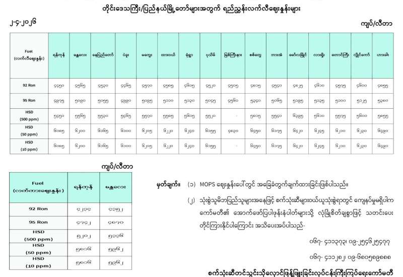 ရန်ကုန်မြို့နှင့် မန္တလေးမြို့အတွက် ရည်ညွှန်းလက်ကားဈေးနှုန်းများနှင့် ပြည်ထောင်စုနယ်မြေ နေပြည်တော်၊ တိုင်းဒေသကြီး/ ပြည်နယ် မြို့တော်များအတွက် ရည်ညွှန်းလက်လီဈေးနှုန်းများ
