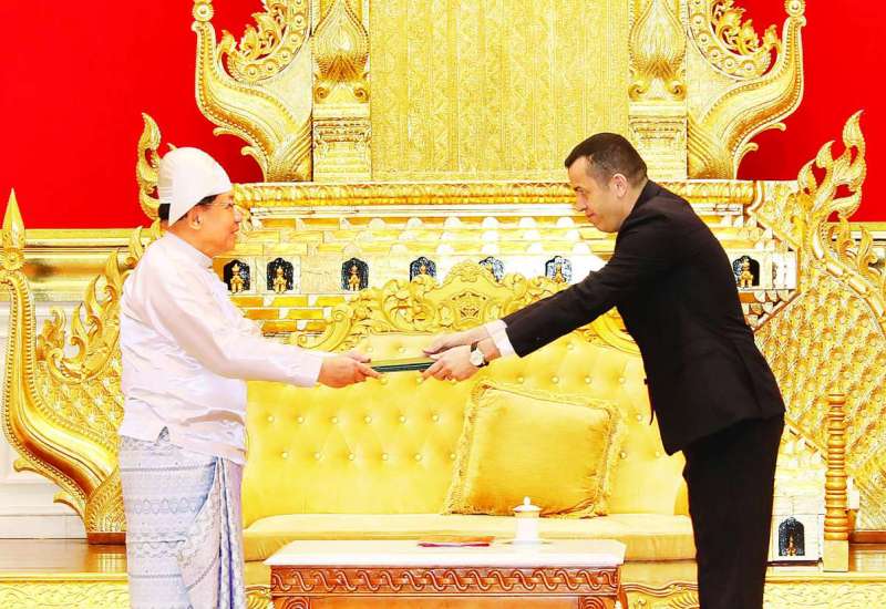 ပြည်ထောင်စုသမ္မတမြန်မာနိုင်ငံတော် ယာယီသမ္မတ နိုင်ငံတော်လုံခြုံရေးနှင့် အေးချမ်းသာယာရေးကော်မရှင်ဥက္ကဋ္ဌ ဗိုလ်ချုပ်မှူးကြီး မင်းအောင်လှိုင်ထံ မြန်မာနိုင်ငံဆိုင်ရာ အယ်လ်ဂျီးရီးယား ပြည်သူ့ဒီမိုကရက်တစ်သမ္မတနိုင်ငံ သံအမတ်ကြီး H.E. Mr. Azeddine BECHKA က ယနေ့နံနက် ၁၀ နာရီတွင် နေပြည်တော်ရှိ အမျိုးသားကာကွယ်ရေးနှင့် လုံခြုံရေးကောင်စီရုံးသံတမန်ဆောင်ဧည့်ခန်းမ၌ ၎င်း၏ သံအမတ်ခန့်အပ်လွှာကို ပေးအပ်သည်။