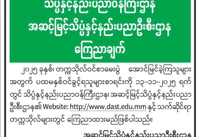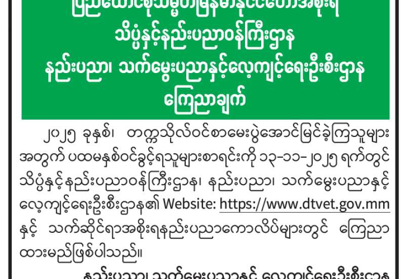 ပြည်ထောင်စုသမ္မတမြန်မာနိုင်ငံတော်အစိုးရ သိပ္ပံနှင့်နည်းပညာဝန်ကြီးဌာနနည်းပညာ၊ သက်မွေးပညာနှင့်လေ့ကျင့်ရေးဦးစီးဌာနကြေညာချက်