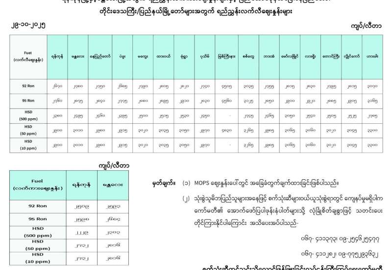ရန်ကုန်မြို့နှင့် မန္တလေးမြို့အတွက် ရည်ညွှန်းလက်ကားဈေးနှုန်းများနှင့် ပြည်ထောင်စုနယ်မြေ နေပြည်တော်၊ တိုင်းဒေသကြီး/ပြည်နယ် မြို့တော်များအတွက် ရည်ညွှန်းလက်လီဈေးနှုန်းများ