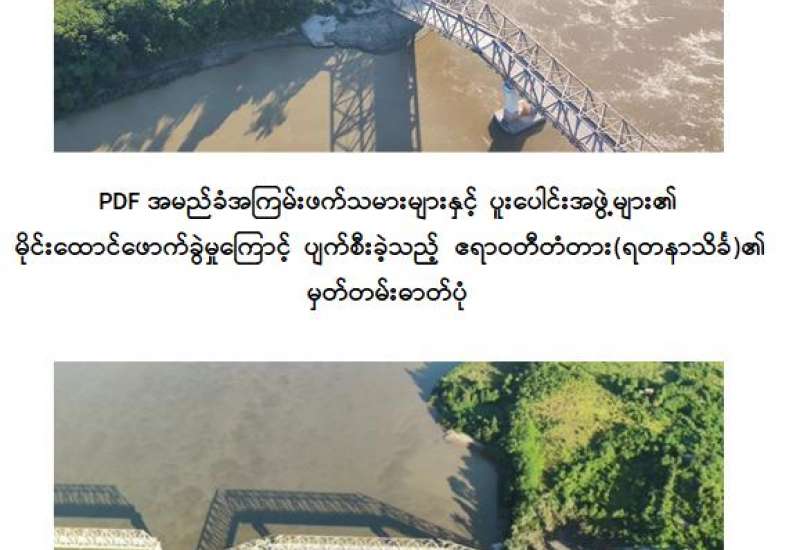 PDF အမည်ခံအကြမ်းဖက်သမားများနှင့် ပူးပေါင်းအဖွဲ့များသည် တိုင်းပြည်တည်ငြိမ်အေးချမ်းမှုပျက်ပြားစေရန်နှင့် ဒေသတွင်းကုန်စည်စီးဆင်းမှုများပျက်ပြားစေရန်ရည်ရွယ်၍ အများပြည်သူသွားလာအသုံးပြုလျက်ရှိသည့် လမ်း၊ တံတားများအား မိုင်းထောင်ဖောက်ခွဲဖျက်ဆီးခြင်းများကို ယုတ်မာရိုင်းစိုင်းစွာဥပဒေမဲ့ကျူးလွန်လျက်ရှိကြရာ ယနေ့တွင် ရွှေဘို-ကျောက်မြောင်း-စဉ့်ကူး-မန္တလေးသွားကားလမ်းပေါ်ရှိ ဧရာဝတီမြစ်ကူးတံတားတစ်စင်းဖြစ်သည့် ဧရာဝတီတံတား(ရတနာသိင်္ခ)အား အကြမ်းဖက်သမားများက ယုတ်မာရိုင်းစိုင်းစွာမိုင်းထောင်ဖောက်ခွဲဖျက်ဆီးခဲ့ကြောင်းသိရသည်။