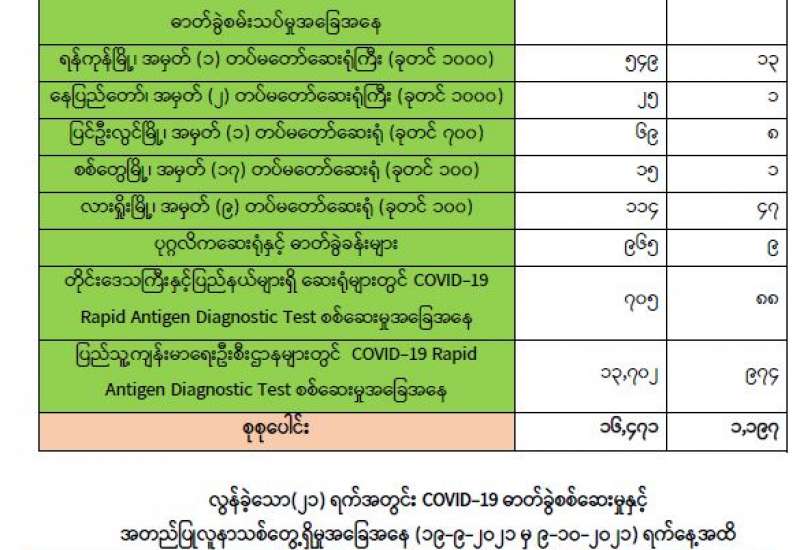 ကျန်းမာရေးဝန်ကြီးဌာနအနေဖြင့် နိုင်ငံအတွင်း ကူးစက်ဖြစ်ပွားနေသော COVID-19 ရောဂါ ကာကွယ်၊ ကုသ၊ ထိန်းချုပ်ရေး လုပ်ငန်းများကို အရှိန်အဟုန်မြှင့် ဆောင်ရွက်လျက်ရှိရာ ရောဂါ ထိန်းချုပ်ရေးလုပ်ငန်းများ အောင်မြင်နိုင်ရေးအတွက် ပြည်သူလူထု အနေဖြင့် ကျန်းမာရေး ဝန်ကြီးဌာနမှ ထုတ်ပြန်ထားသော COVID-19 ရောဂါ ကာကွယ် ထိန်းချုပ်ရေးဆိုင်ရာ စည်းကမ်း များကို စနစ်တကျ လိုက်နာဆောင်ရွက်ရန်လိုအပ်ပြီး COVID-19 ကာကွယ်ဆေးထိုးနှံမှု ခံယူခြင်းအား အထူးဂရုပြု ပူးပေါင်းဆောင်ရွက် ကြရန် လိုအပ်ပါသည်။