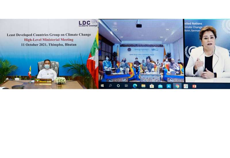 ကုလသမဂ္ဂ ရာသီဥတုပြောင်းလဲမှုဆိုင်ရာ မူဘောင်သဘောတူစာချုပ်အဖွဲ့ (UNFCCC) အတွင်းရေးမှူးရုံးနှင့် ဖွံ့ဖြိုးမှုအနည်းဆုံး နိုင်ငံများအုပ်စု၏ အလှည့်ကျဥက္ကဋ္ဌဖြစ်သူ ဘူတန်နိုင်ငံ တော်ဝင်အစိုးရက အိမ်ရှင်အဖြစ်ဦးဆောင်၍ “ဖွံ့ဖြိုးမှုအနည်းဆုံးနိုင်ငံများ အုပ်စု ဝန်ကြီးများ အစည်းအဝေး” ကို ယနေ့ညနေပိုင်းတွင် ဗွီဒီယိုကွန်ဖရင့်စနစ်ဖြင့် ကျင်းပရာ သယံဇာတနှင့် သဘာဝ ပတ်ဝန်းကျင် ထိန်းသိမ်းရေးဝန်ကြီးဌာန၊ ပြည်ထောင်စုဝန်ကြီး ဦးခင်မောင်ရီသည် အဖွဲ့ဝင် ၄၆ နိုင်ငံမှ ပတ်ဝန်းကျင်ဆိုင်ရာ ဝန်ကြီးများ၊ အဆင့်မြင့်ကိုယ်စားလှယ်များနှင့်အတူ တက်ရောက်ဆွေးနွေးသည်။