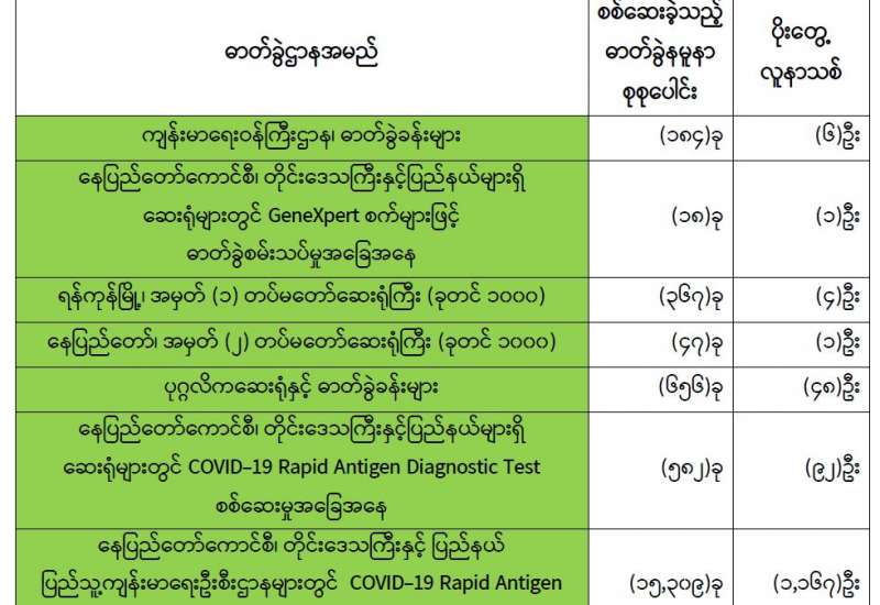 ကျန်းမာရေးဝန်ကြီးဌာနအနေဖြင့် နိုင်ငံအတွင်း ကူးစက်ဖြစ်ပွားနေသော COVID-19 ရောဂါ ကာကွယ်၊ ကုသ၊ ထိန်းချုပ်ရေးလုပ်ငန်းများကို အရှိန်အဟုန်မြှင့်ဆောင်ရွက်လျက်ရှိရာ ရောဂါ ထိန်းချုပ်ရေးလုပ်ငန်းများ အောင်မြင်နိုင်ရေးအတွက် ပြည်သူလူထုအနေဖြင့် ကျန်းမာရေးဝန်ကြီး ဌာနမှ ထုတ်ပြန်ထားသော COVID-19 ရောဂါကာကွယ်ထိန်းချုပ်ရေးဆိုင်ရာ စည်းကမ်းများကို စနစ်တကျ လိုက်နာဆောင်ရွက်ရန်လိုအပ်ပြီး COVID-19 ကာကွယ်ဆေးထိုးနှံမှုခံယူခြင်းအား အထူး ဂရုပြု ပူးပေါင်းဆောင်ရွက်ကြရန် လိုအပ်ပါသည်။