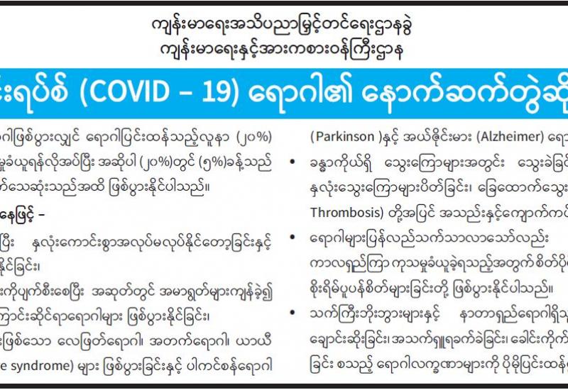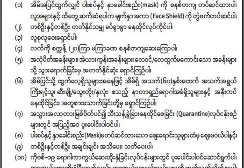 ၁။ ယခုအခါ နိုင်ငံအတွင်း COVID-19 ကပ်ရောဂါ တတိယလှိုင်းအဖြစ် တိုင်းဒေသကြီး/ပြည်နယ် များတွင် COVID-19 ရောဂါ သံသယလူနာနှင့် COVID-19 ရောဂါ ပိုးတွေ့လူနာ များပြား လျက်ရှိပြီး ကျန်းမာရေးနှင့် အားကစား ဝန်ကြီးဌာနရှိ ကျန်းမာရေးဝန်ထမ်းများအနေဖြင့် ပြည်သူများအပေါ် စေတနာအပြည့်အဝထားကာ အထူး ကြိုးစား ဆောင်ရွက်လျက်ရှိပါသည်။