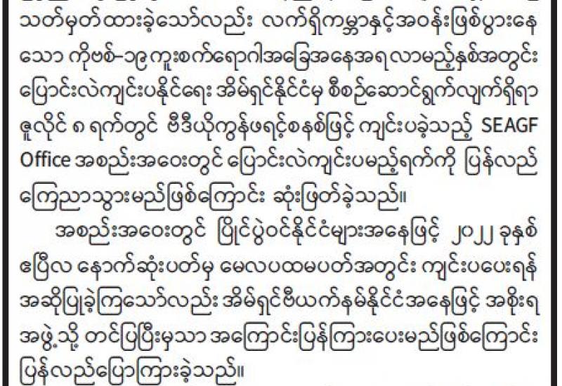 အရေးပေါ်အခြေအနေစီမံခန့်ခွဲမှုဗဟိုဌာန၏လုပ်ငန်းဆောင်ရွက်နေမှုအခြေအနေများရှင်းလင်းတင်ပြခြင်း အခမ်းအနားကို ယနေ့နံနက်ပိုင်းတွင် လူမှုဝန်ထမ်း၊ ကယ်ဆယ်ရေးနှင့် ပြန်လည် နေရာချထားရေးဝန်ကြီးဌာန အရေးပေါ်အခြေအနေ စီမံခန့်ခွဲမှုဗဟိုဌာန(EO)၌ ကျင်းပသည်။