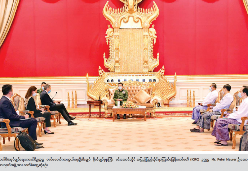 နိုင်ငံတော်စီမံအုပ်ချုပ်ရေးကောင်စီဥက္ကဋ္ဌ၊ တပ်မတော်ကာကွယ်ရေးဦးစီးချုပ် ဗိုလ်ချုပ်မှူးကြီး မင်းအောင်လှိုင်သည် အပြည်ပြည်ဆိုင်ရာကြက်ခြေနီကော်မတီ (ICRC) ဥက္ကဋ္ဌ Mr. Peter Maurer ဦးဆောင်သည့် ကိုယ်စားလှယ်အဖွဲ့အား ယနေ့နံနက် ၁၁ နာရီတွင် နိုင်ငံတော်စီမံအုပ်ချုပ်ရေးကောင်စီရုံး၌ လက်ခံတွေ့ဆုံသည်။