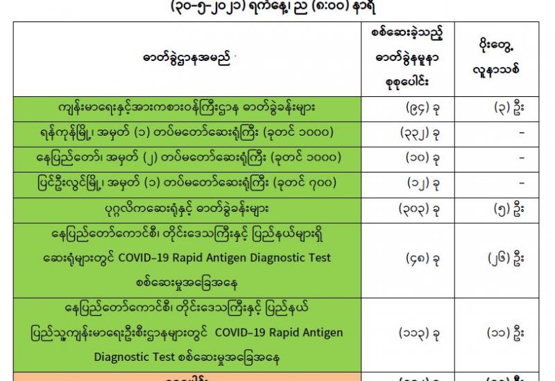 (၂၉-၅-၂၀၂၁) ရက်နေ့၊ ည (၈:၀၀) နာရီမှ (၃၀-၅-၂၀၂၁) ရက်နေ့၊ ည (၈:၀၀) နာရီအတွင်း ဓာတ်ခွဲနမူနာစုစုပေါင်း (၉၁၂) ခုအား စစ်ဆေးပြီးစီးခဲ့ရာ COVID-19 ရောဂါ ဓာတ်ခွဲအတည်ပြု လူနာသစ် (၄၅) ဦး တွေ့ရှိရပါသည်။ သို့ဖြစ်ပါ၍ ယနေ့အထိ ဓာတ်ခွဲနမူနာ စုစုပေါင်း (၂,၆၁၉,၆၄၂) ခု အား စစ်ဆေးခဲ့ပြီး COVID-19 ဓာတ်ခွဲအတည်ပြုလူနာ စုစုပေါင်း (၁၄၃,၅၇၁) ဦး ရှိပြီ ဖြစ်ပါသည်။