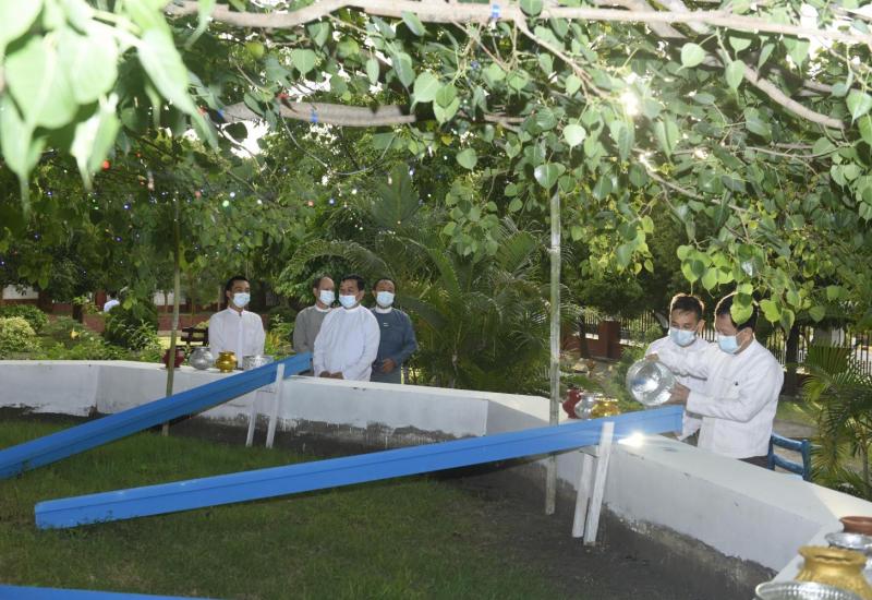ပြည်ထဲရေးဝန်ကြီးဌာန မိသားစုများ၏ ကဆုန်ညောင်ရေသွန်းလောင်း ပူဇော်ပွဲ အခမ်းအနား ကို ယနေ့ ညနေပိုင်းတွင် ဒုတိယဝန်ကြီး ဗိုလ်ချုပ်စိုးတင့်နိုင် ဦးဆောင်၍ ပြည်ထဲရေးဝန်ကြီးဌာန မိသားစုများက နေပြည်တော်၊ ဇမ္ဗူသီရိမြို့နယ်၊ တောင်းဆုရ “ဝ” စေတီတော်ရှိ မဟာဗောဓိ ညောင်ပင်တွင် ညောင်ရေ သွန်းလောင်းပူဇော်ကြသည်။